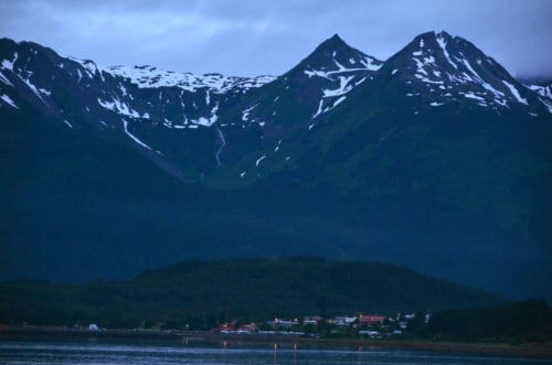 夜。一瞬霧が晴れた時には、アラスカの山並みを見ることができます。