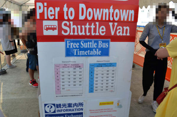 クルーズ船のシャトルバスが、天文館の近くに停まります。