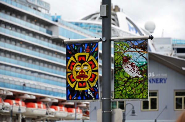 街灯にハンギングバスケットがありお花が綺麗に咲いていたり、こうしてアラスカンアートが見えたり。観光で成り立っている町らしく、どこを見ても楽しいですね。