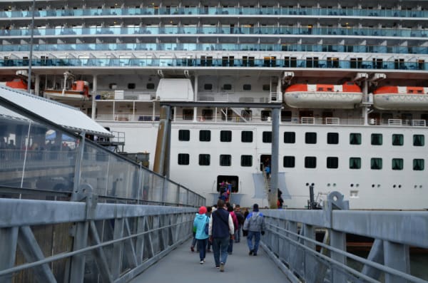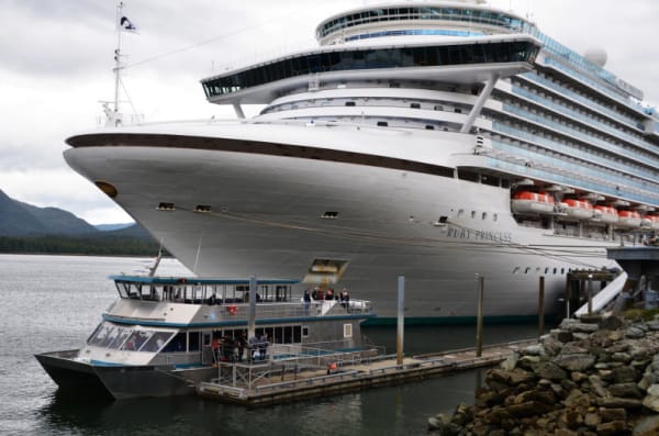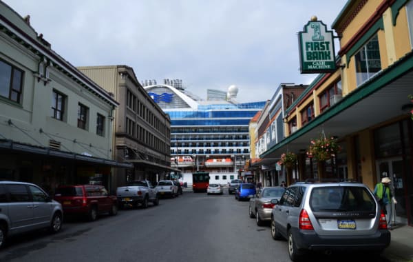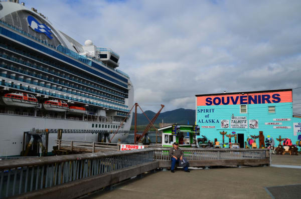 桟橋に対して垂直に伸びる通りからは、どこからもクルーズ船が見えますね。こちらはその名も、DOCK St.。これは、アラスカをアンカレッジ方面からロングクルーズしていたスタープリンセスちゃん。