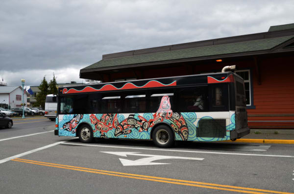 バスはカナダ先住民のインデアンアート柄。鮭が窓まで首を伸ばしていて躍動感があるね。このインデアンアートの絵、買っておけばよかったなぁ…。