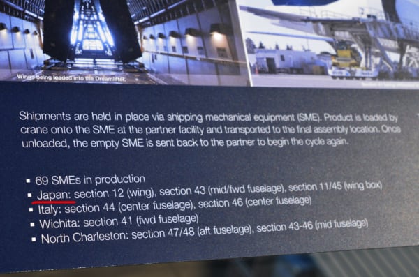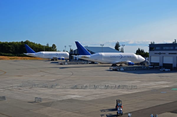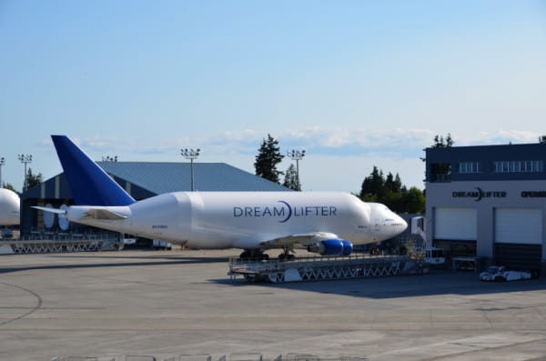 日本には中部国際空港で、三菱重工、川崎重工、富士重工で製造された翼や、他日本のメーカーが作った部品をのせて、シアトルまで運ばれています。