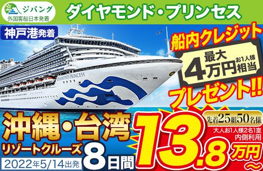 - 【2022年 5月14日発】ダイヤモンド・プリンセス:沖縄・台湾リゾートクルーズ 8日間 Aコース 《最大4万円相当のお得な船内クレジットプレゼント!!》13.8万円〜(内側客室/大人2名1室1名あたり)