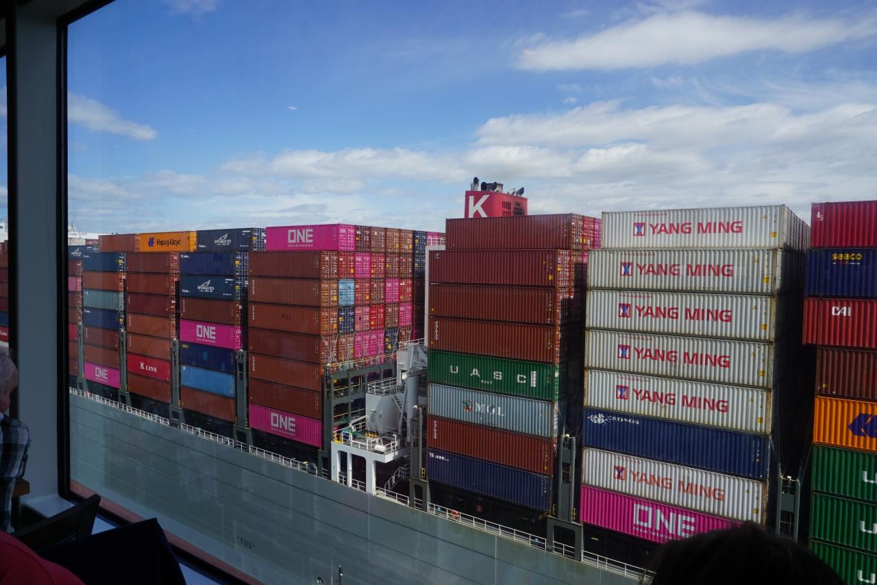 ふと外を見るとKラインの巨大なコンテナ船ミラノブリッジが横を通り抜けていました。