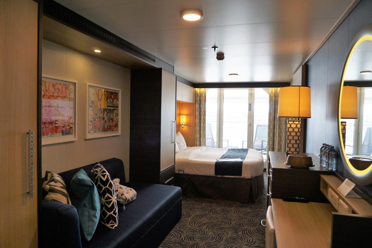 直射日光にさらされるよりはいいのかもしれないけど、クァンタムクラスの場合は中央付近の部屋はへこんでいるのでもう少し下の方の部屋にするか、前方、後方のキャビンの方が良いかもしれません。