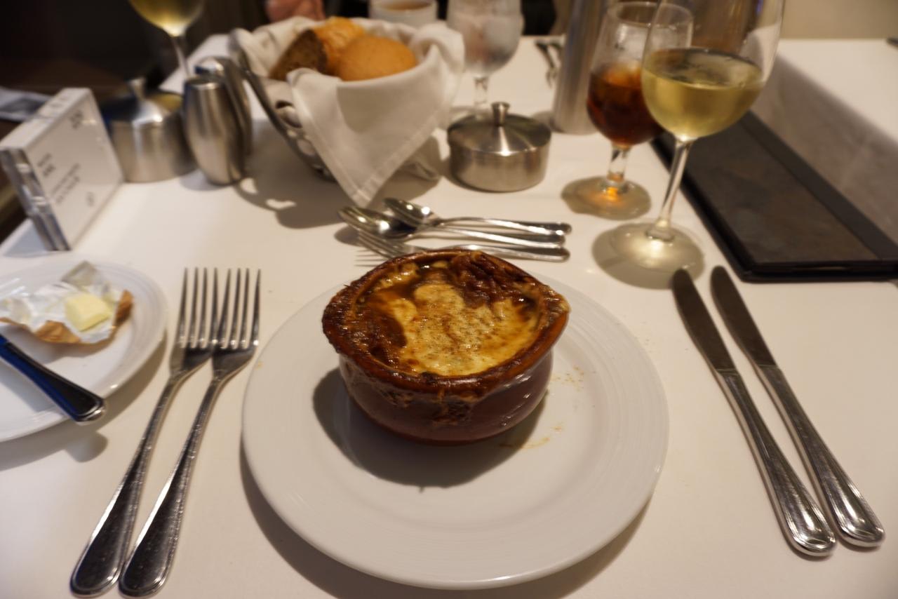 オーソドックスにオニオングラタンスープの前菜を注文。