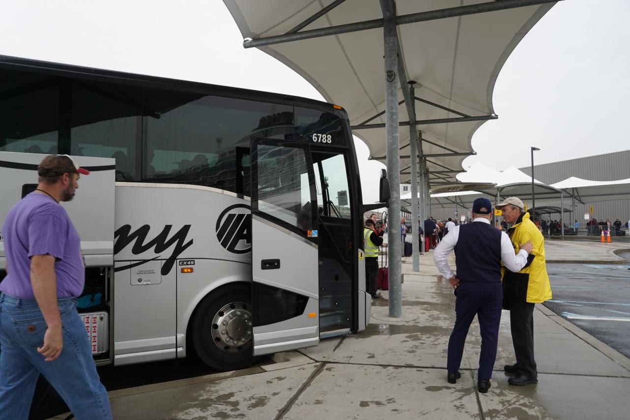 港の人に聞いても良くわからんというのでバスが並ぶエリアをさまよっているとようやくロイヤルカリビアンのロゴの入った黄色いジャケットを着てる男性を発見!