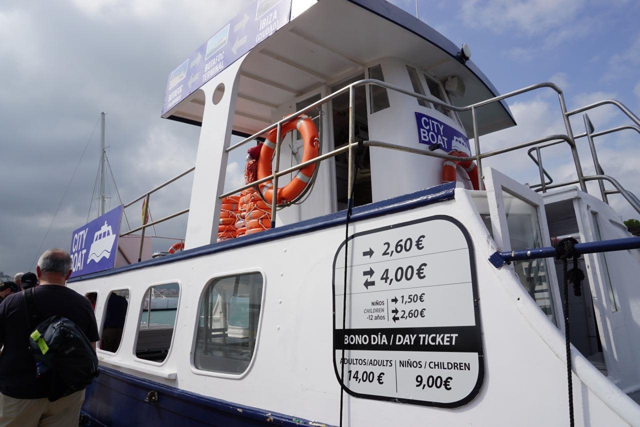 片道2.6ユーロで潮風を浴びながらイビサタウンとクルーズ船を眺めつつ戻ります。