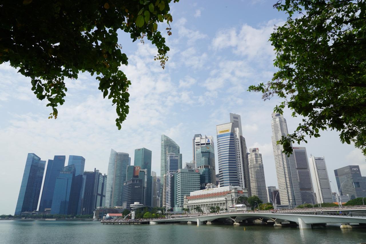 マーライオンとシンガポールの街並み。