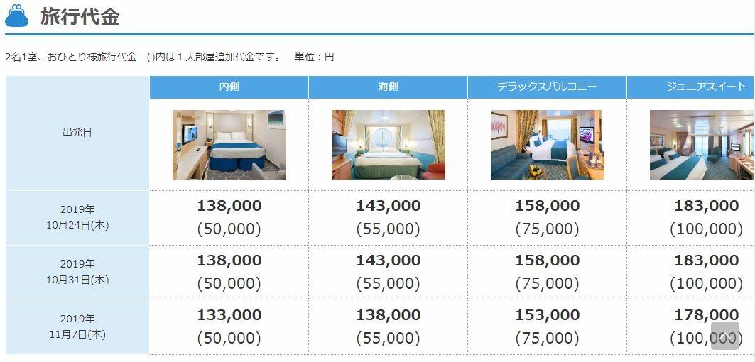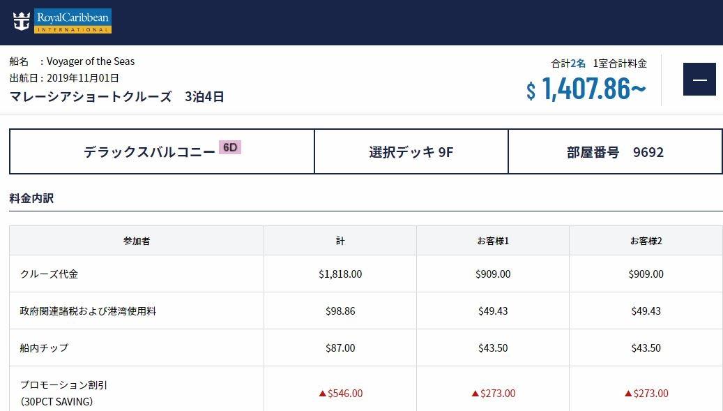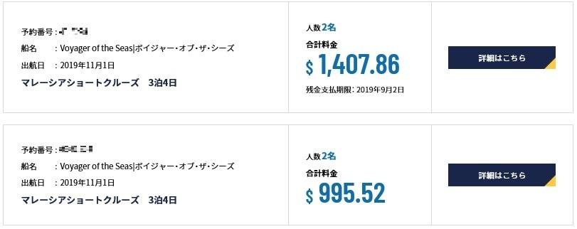 キャビンが選べないので直前までどこになるかわからないけれども1部屋あたり$995.52(諸税チップ込み)の$400のダウンは大きいです。