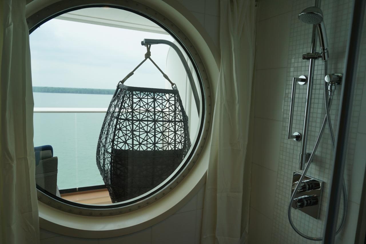 船尾にあるので気が遠くなるほど遠かったけど、ロイヤルジーニーが全てやってくれるし、キャビンから出ることなく全てが揃った客室で非日常を味わうのも船旅ならではなのかな?