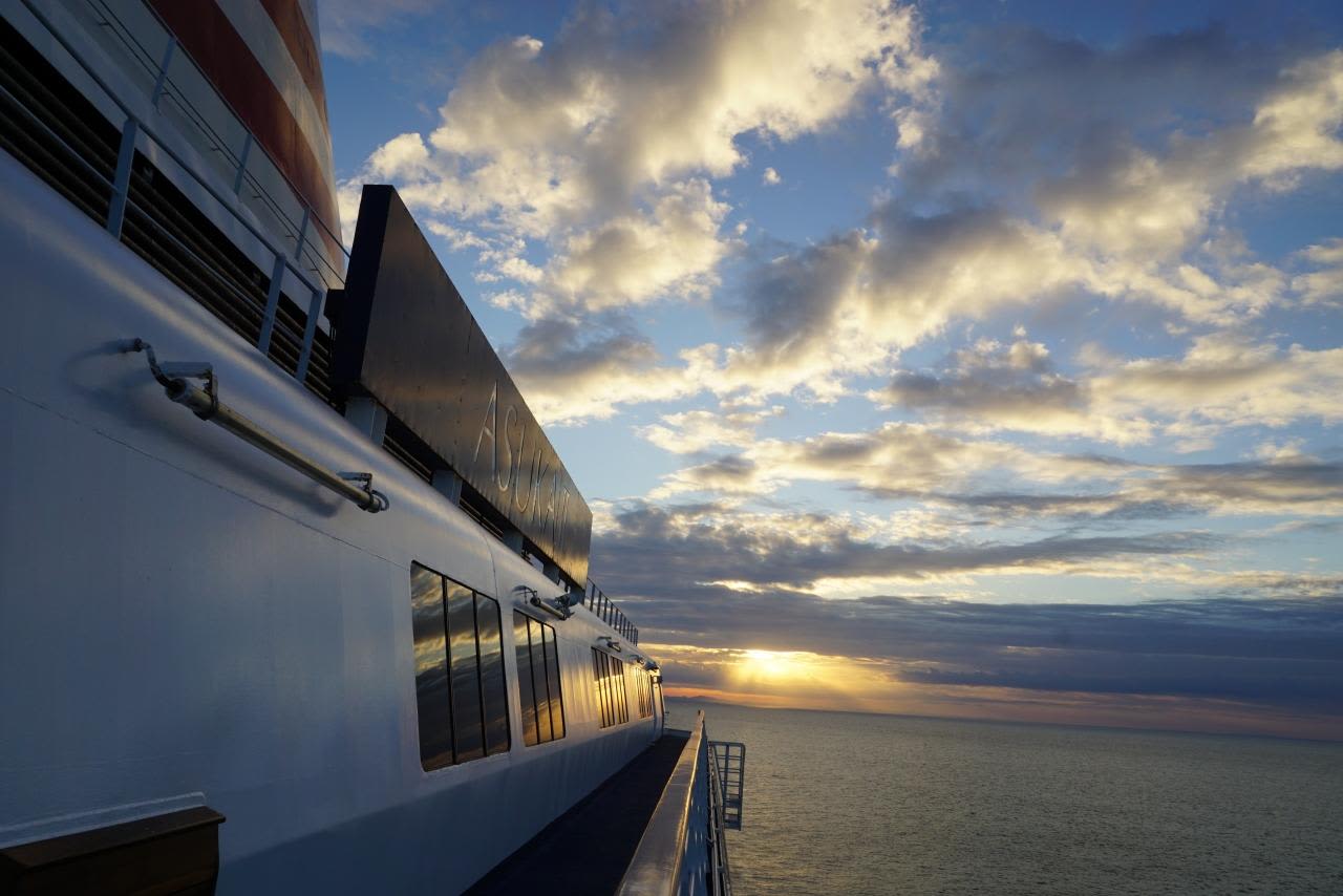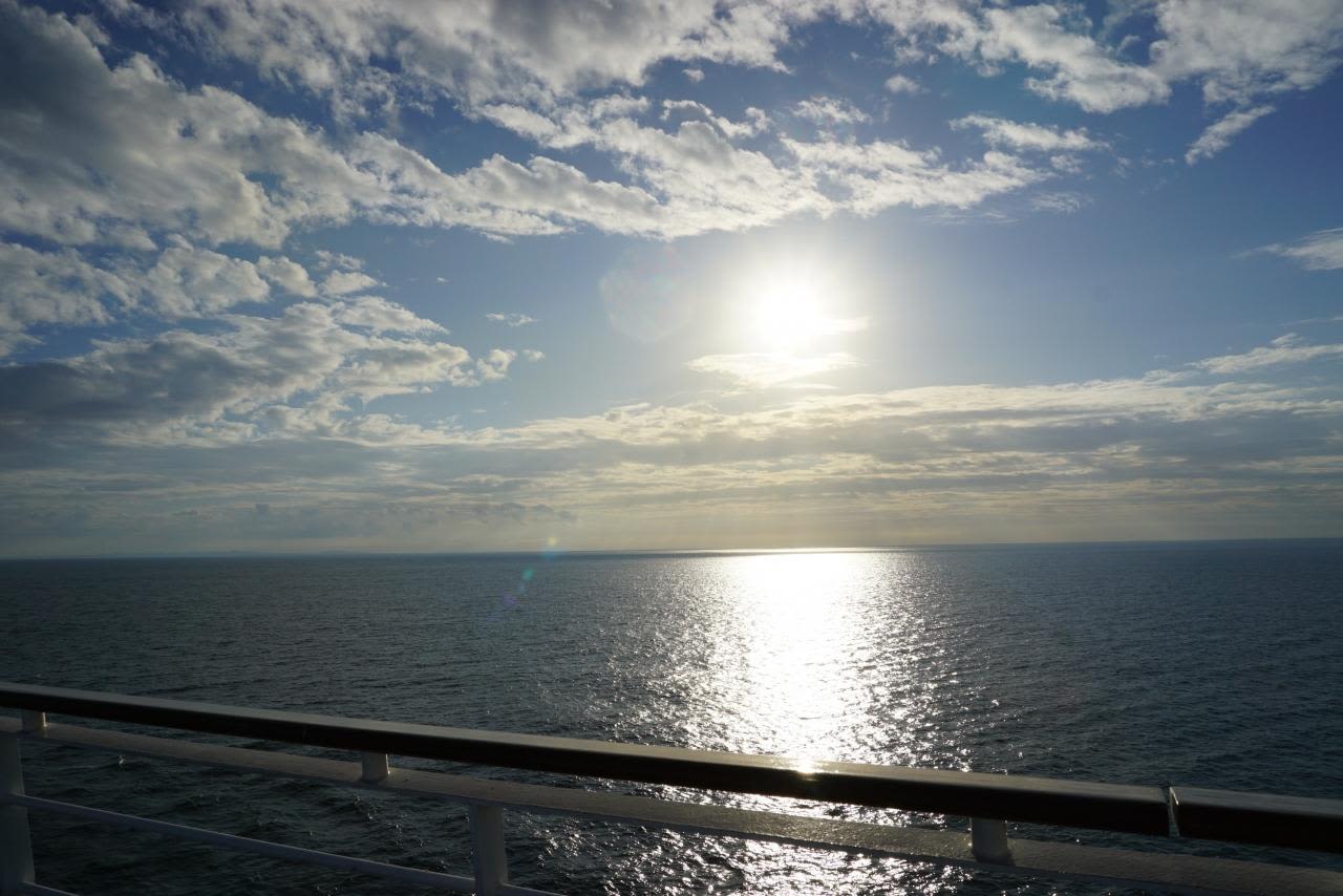 夕日がぎりぎり雲の隙間から見えました。海に沈む夕日がキャビンから楽しめるのも船ならでは!
