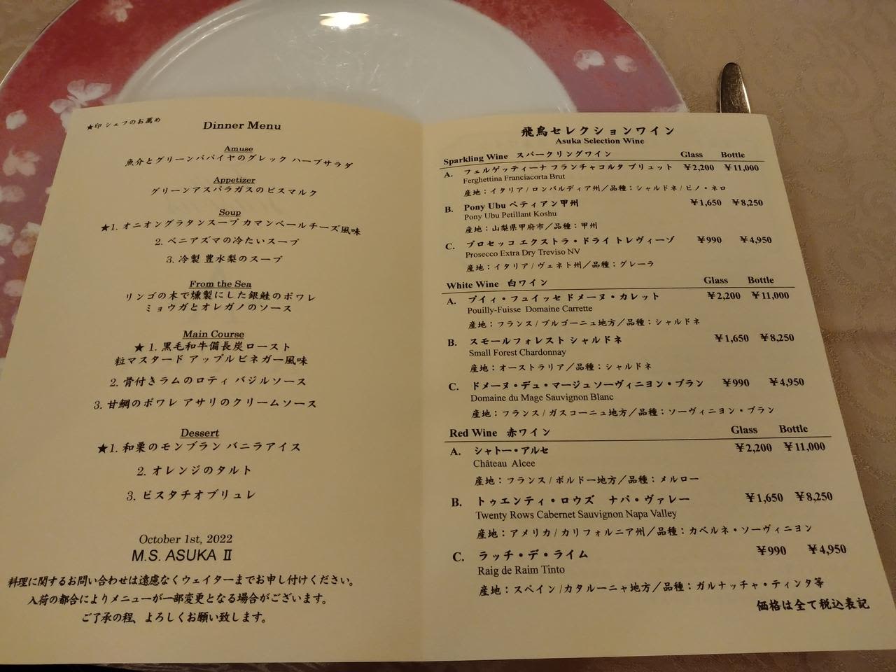 今回のディナーはスープ、メイン、デザートが選べるようになっていました。