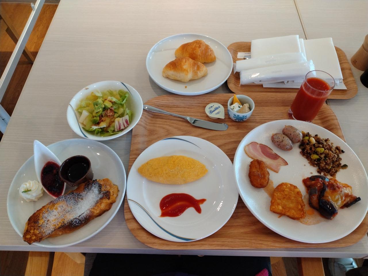 フレンチトースト、プレーンオムレツ、クロワッサンとおかず色々。