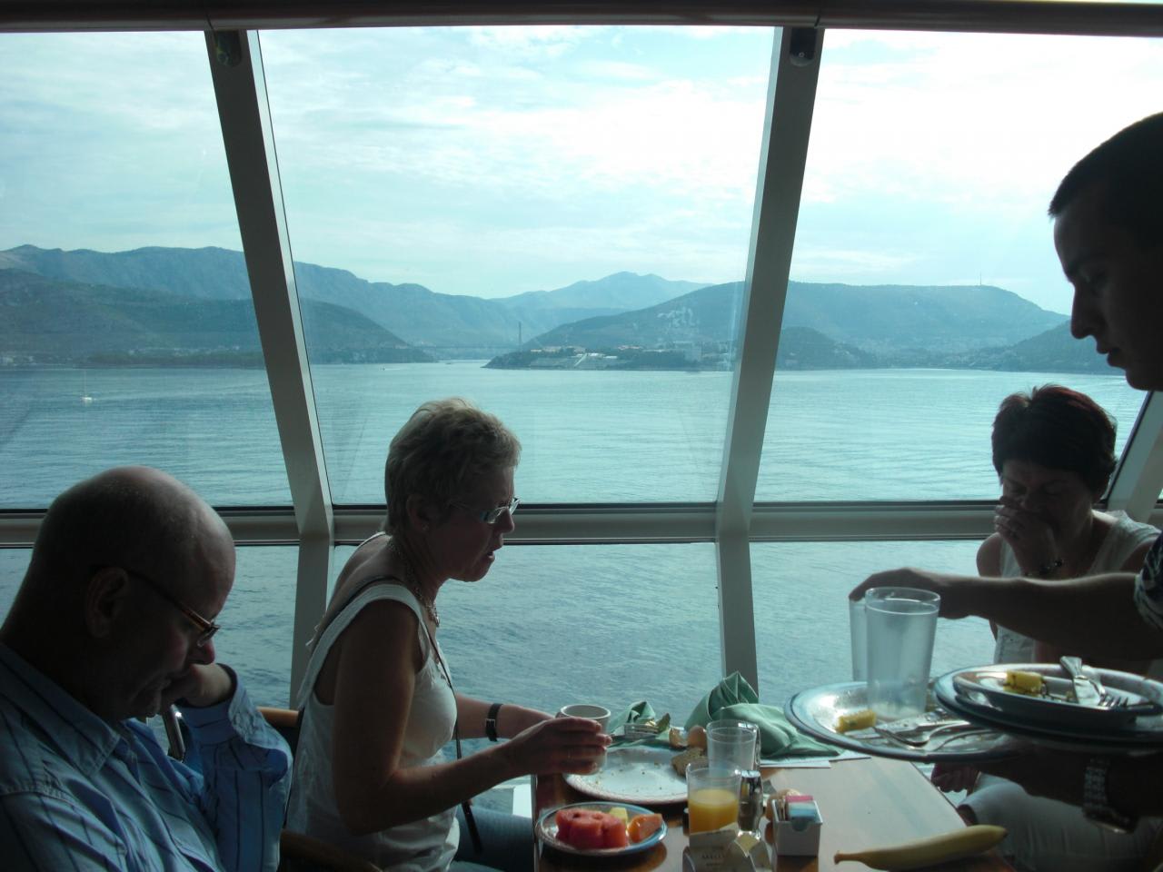 ウィンジャマーカフェで朝食をとりながら入港を待ちます。