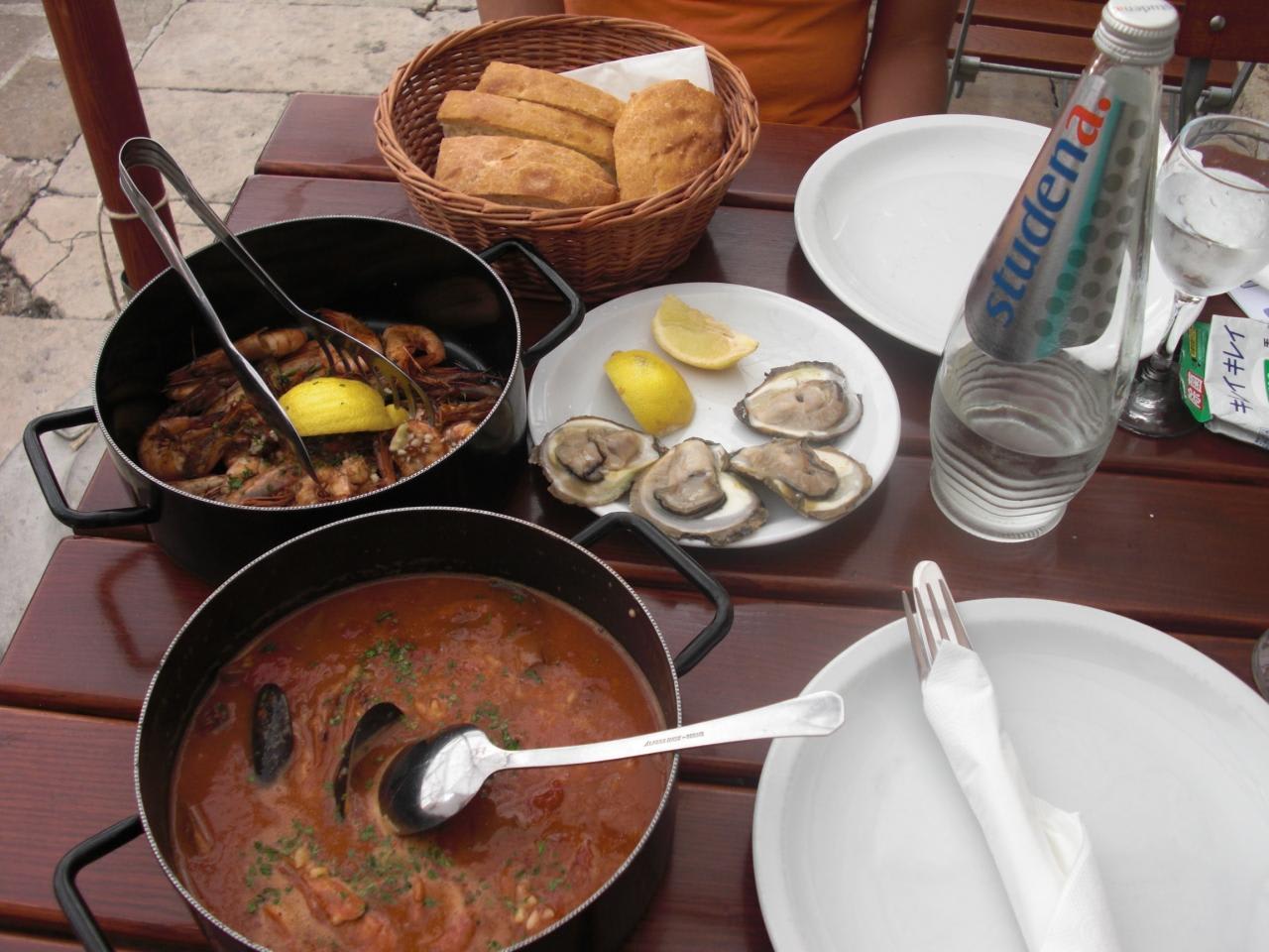 シーフードのリゾット、生牡蠣、小エビのグリル。