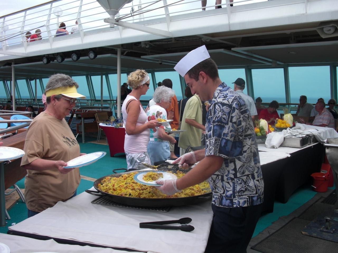 ランチはデッキで巨大なパエリアが!