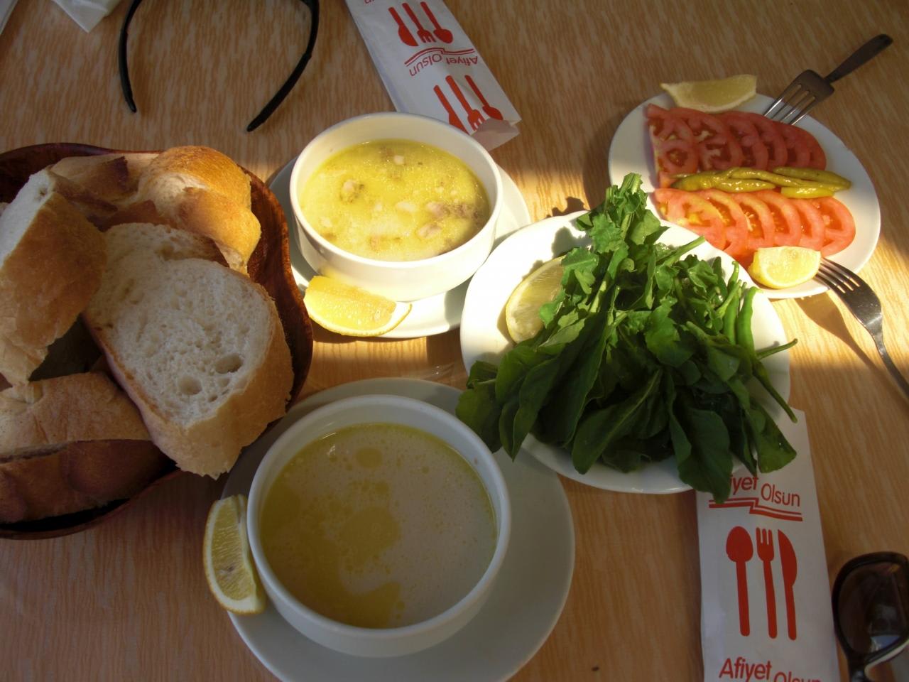 ミント風味のモツの入ったスープ。かなり独特だけどクセになる美味しさでした。サラダ、パン、トマトはサービスのようです。
