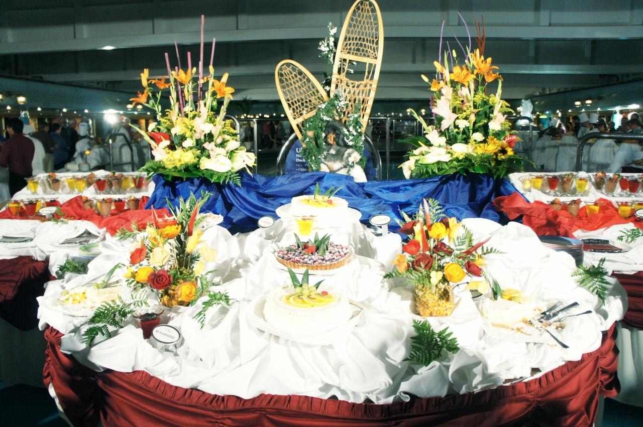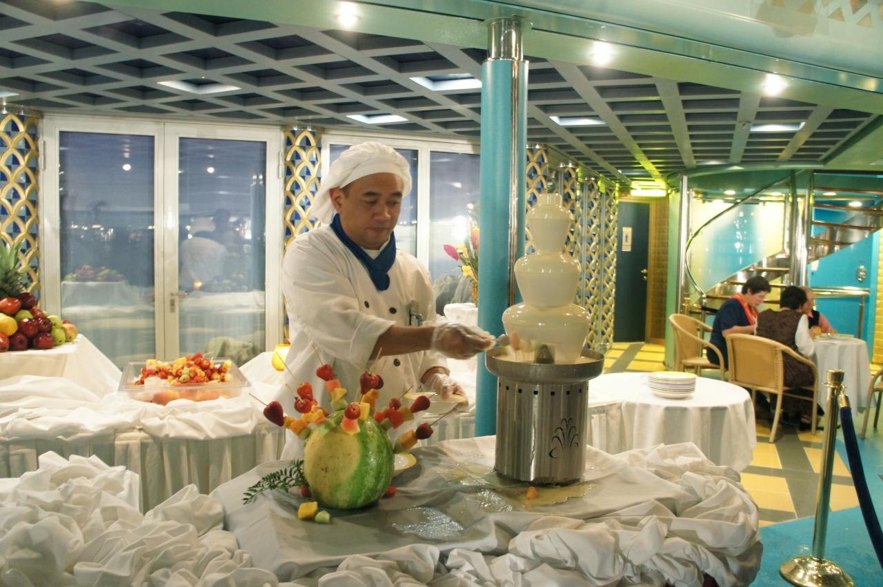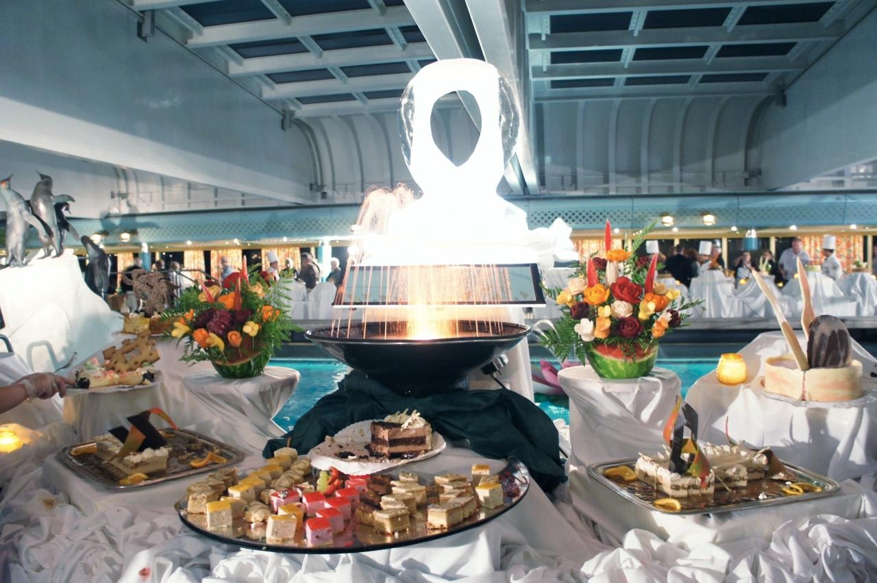 この日の夜はMaster Chef's Partyと言っていつものディナーにちょっとクルーのイベントが加わる日。夜はプールサイドでDessert Extravaganzaが開かれ、2日目にキッチンツアーで見た品の数々が飾られて様々なケーキやチョコレートファウンテンが所狭しと並んでいました