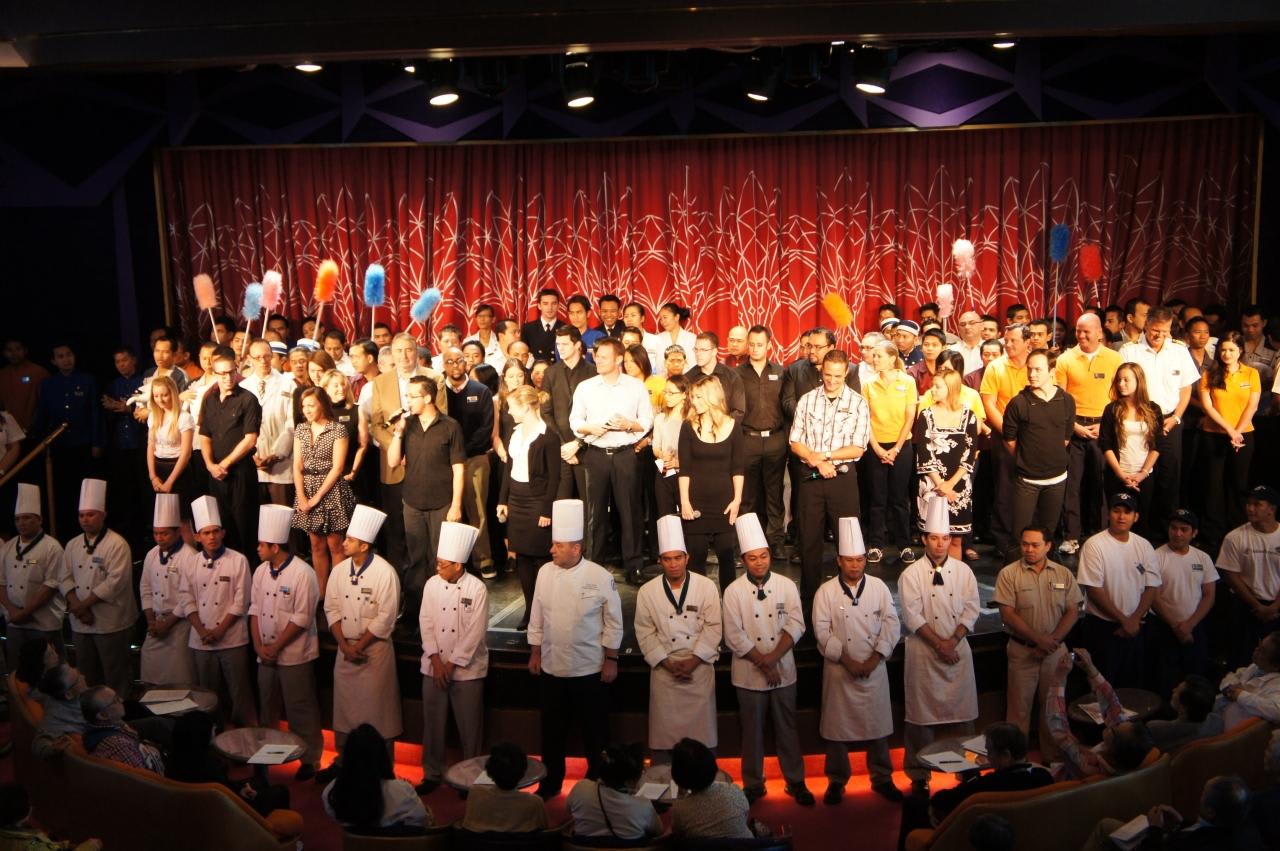 この日開かれた下船説明会では船長、クルーズディレクターなど総出で歌を披露。