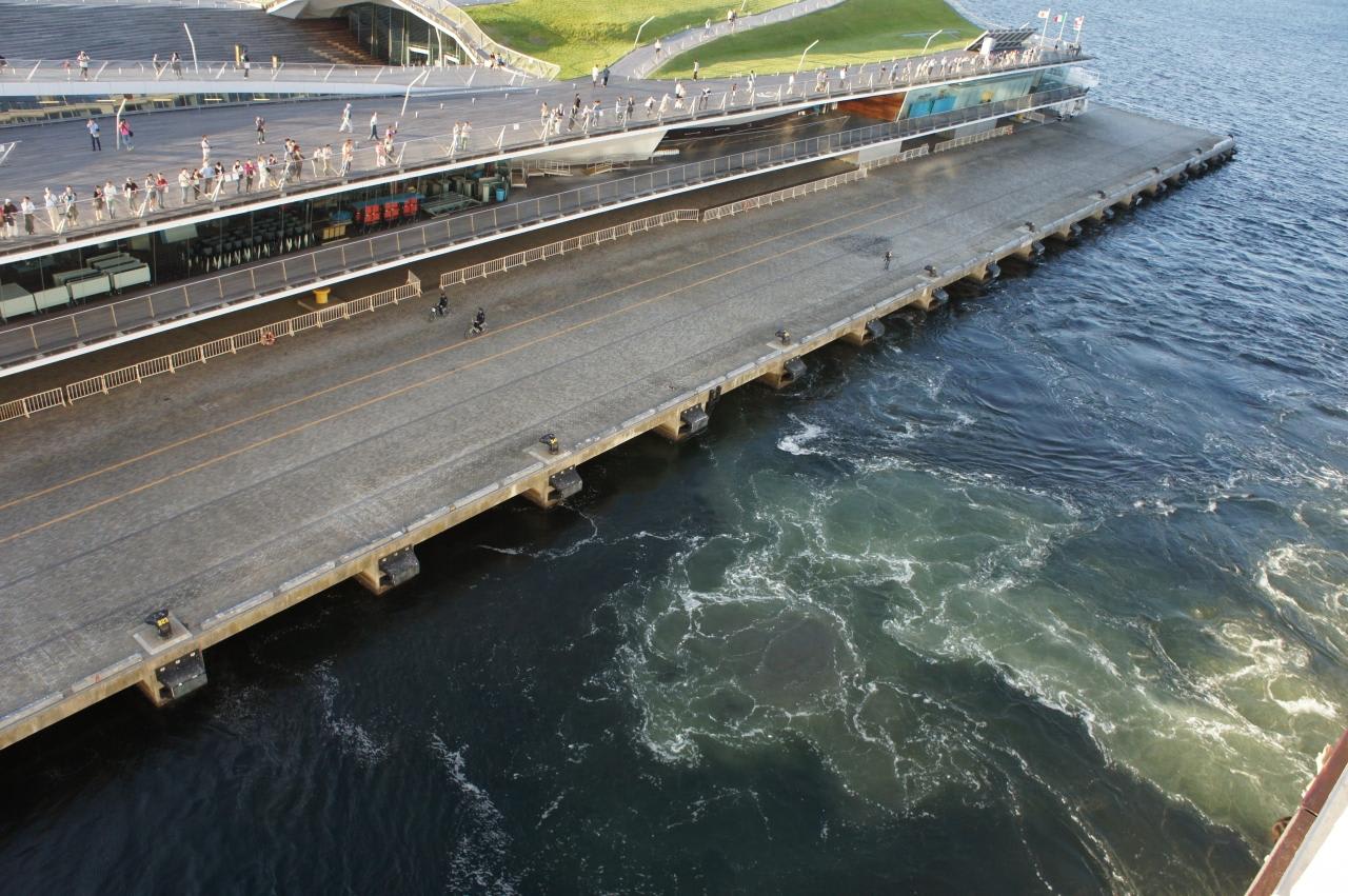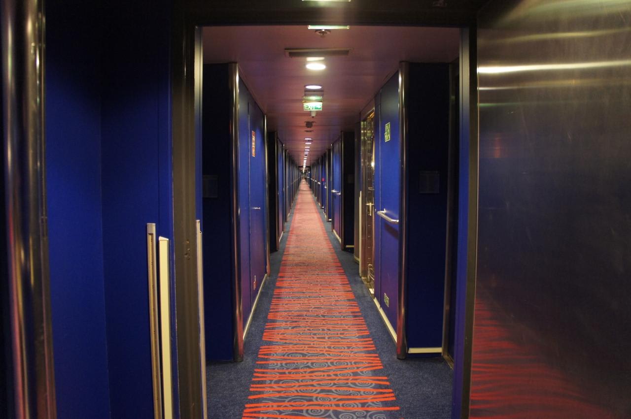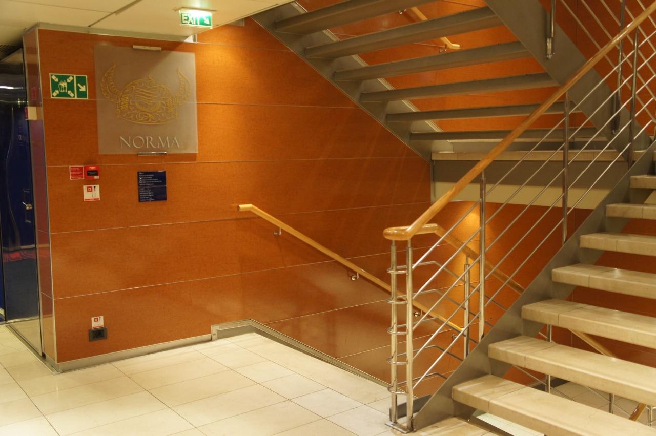 今までどの船でも緩やかな坂道のボーディングブリッジだったのに、ここでは何と途中階段でした。