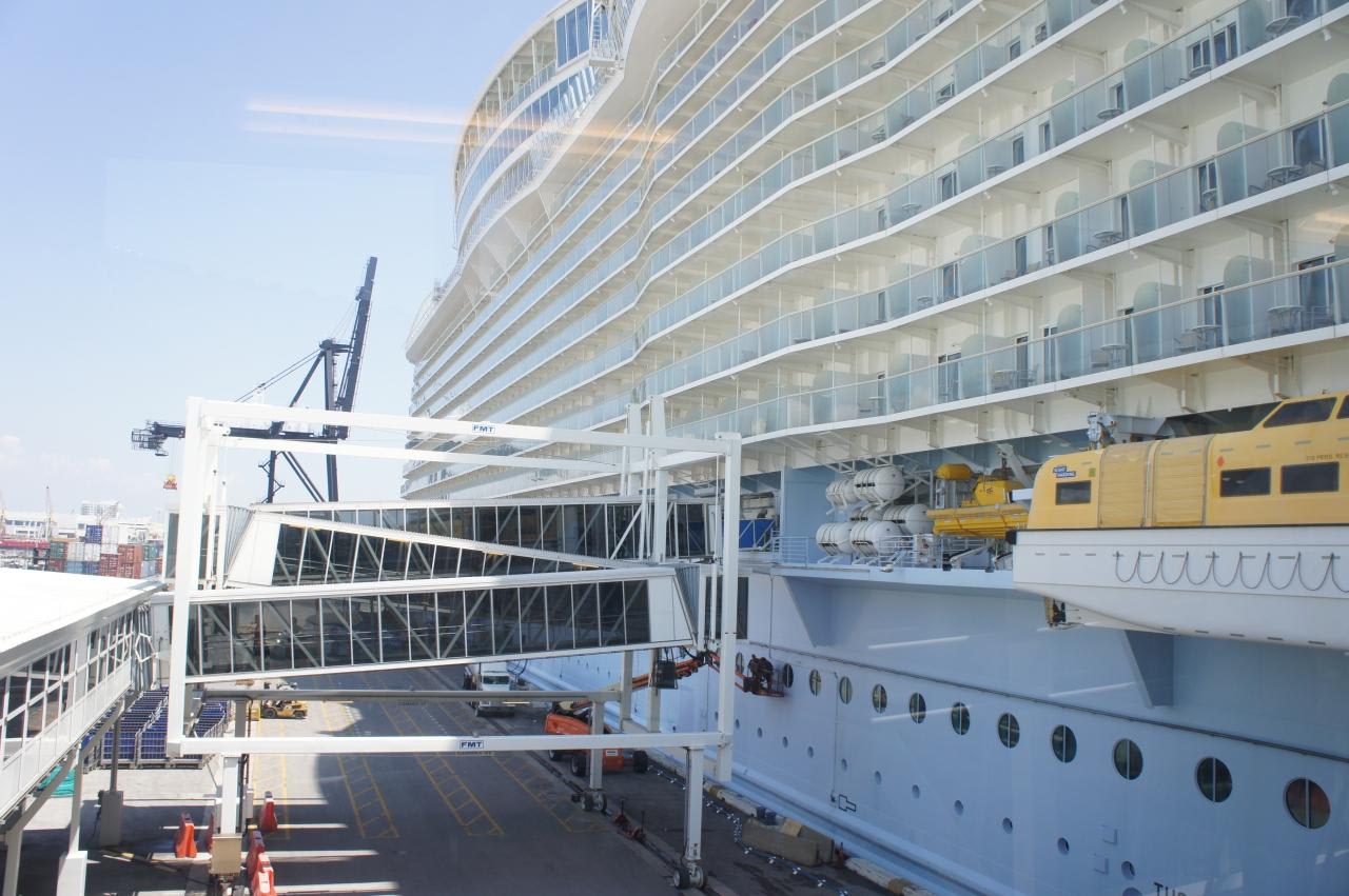 リピーター特典で優先チェックインが受けられるので、お決まりの乗船記念撮影をして22万トンの最大客船に乗り込みます。