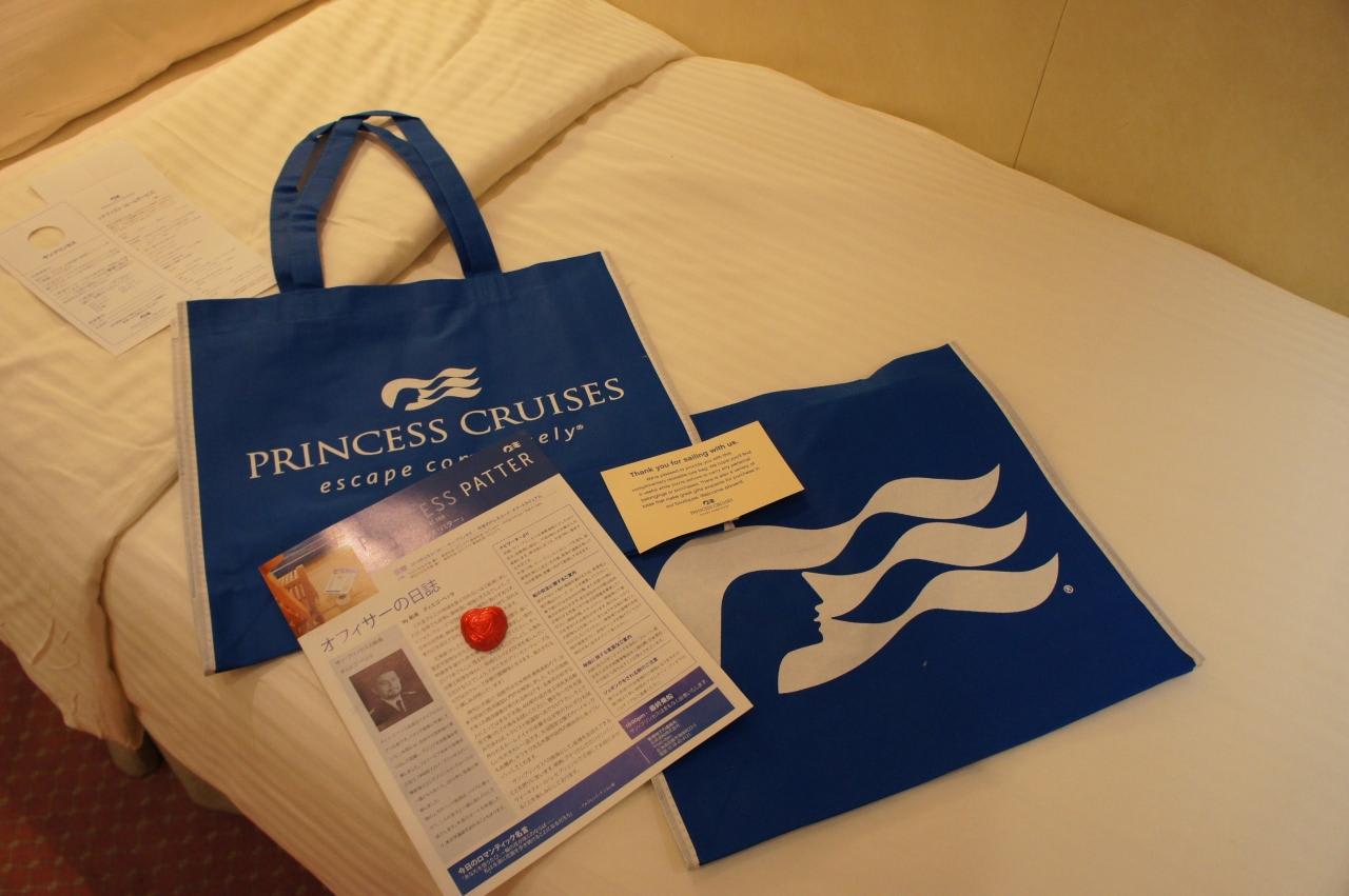 ターンダウンでプリンセスのバッグとチョコとプリンセスパター(船内新聞)が置いてありました。