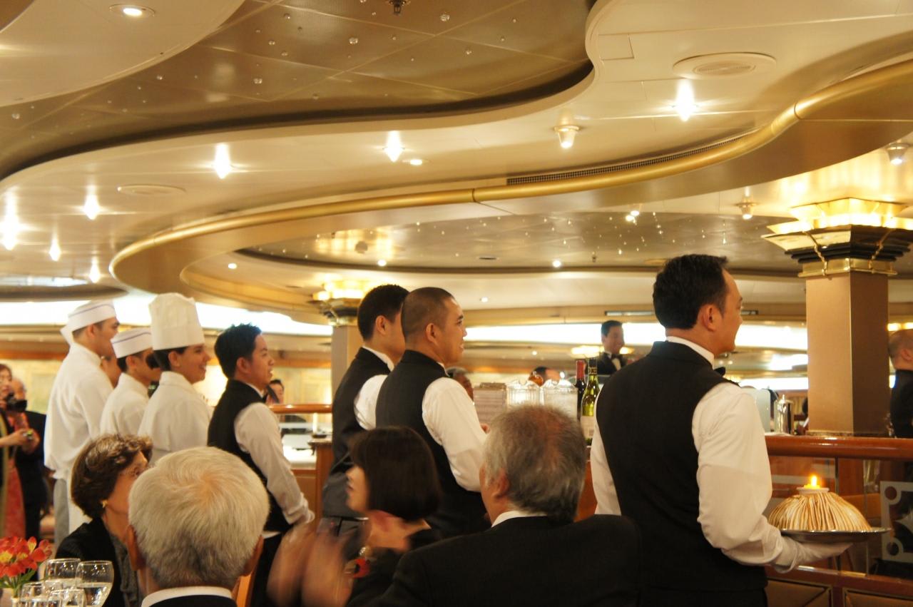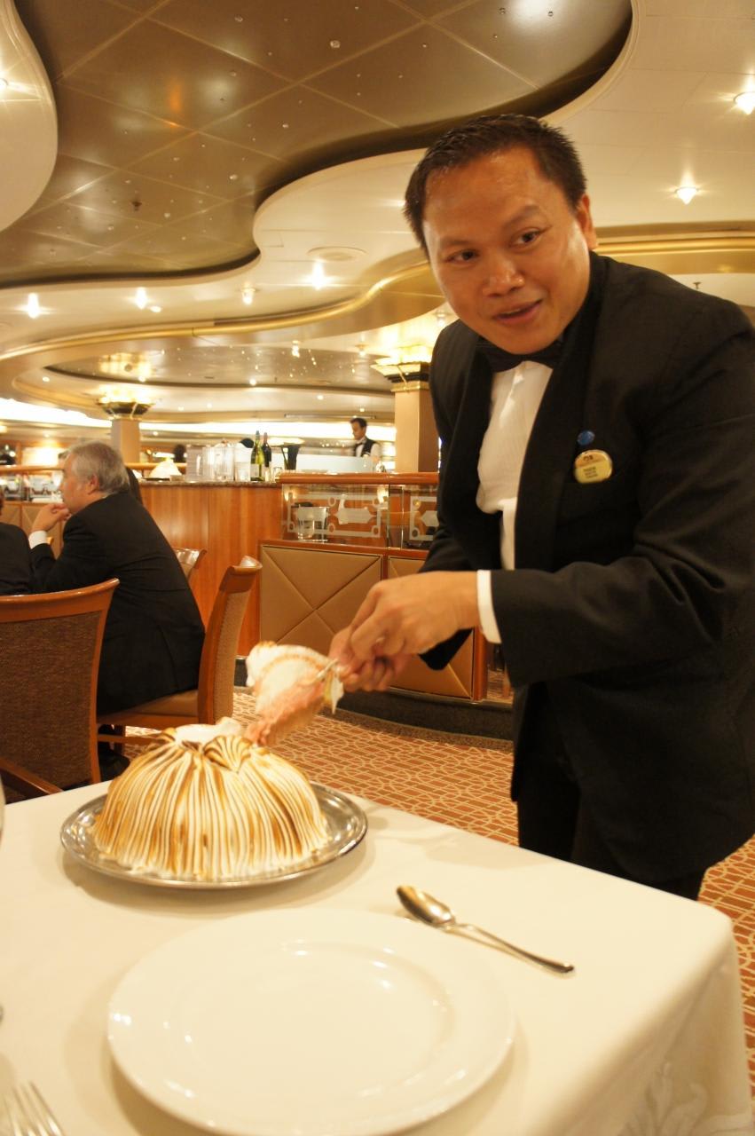 ベイクドアラスカを持ってシェフ&ウェイターがダイニングを回る恒例のイベント。
