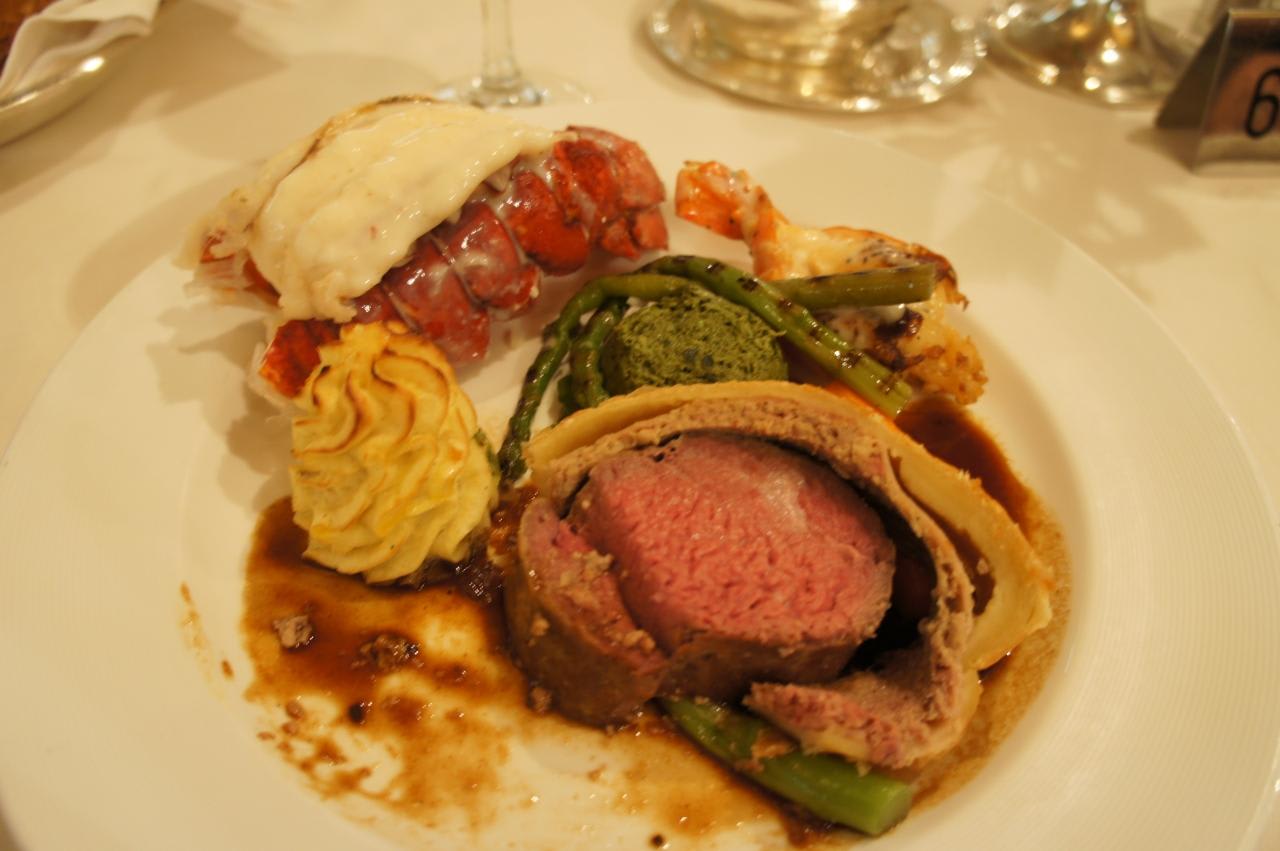行くつもりはなかったのだけれども、大好きなビーフウェリントンとロブスターが出ると聞いていたので母にどちらか食べてくるように言ったのですが、「一人でフォーマルディナーに行くのは嫌だ」と言うのでこれまたボロボロの肌に最低限の化粧をして着替えて行って来ました。