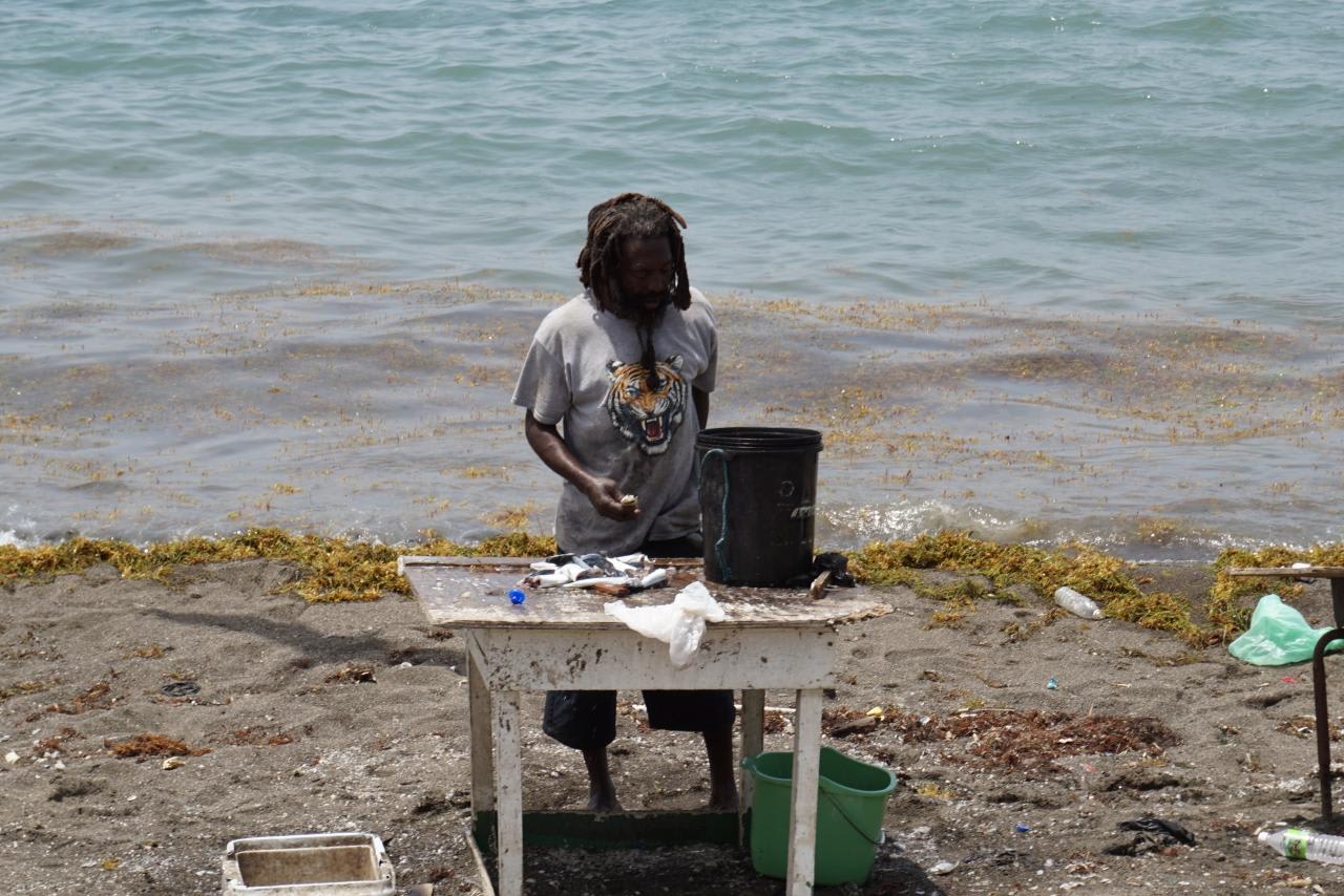 大阪のオバちゃんに負けるとも劣らないトラのTシャツを着たレゲエなおじさんがぶつ切りの魚をテーブルに並べてたけど、鮮度はかなり怪しいです。