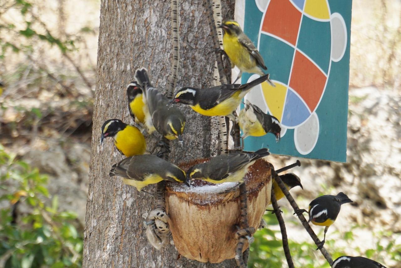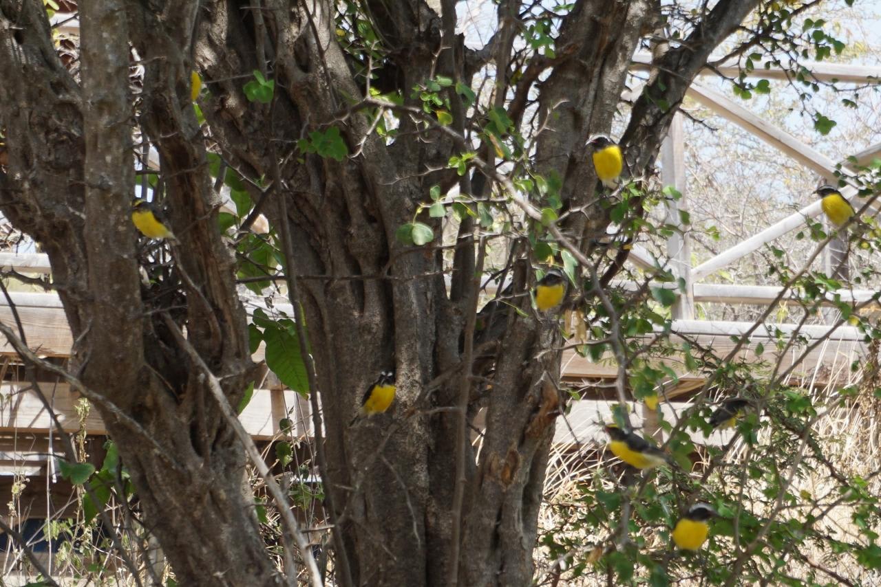 チッチッチッチと鳥が鳴いてるなぁと思ったら、バーの隣の木に雀サイズの小さな黄色い鳥が群がってました。