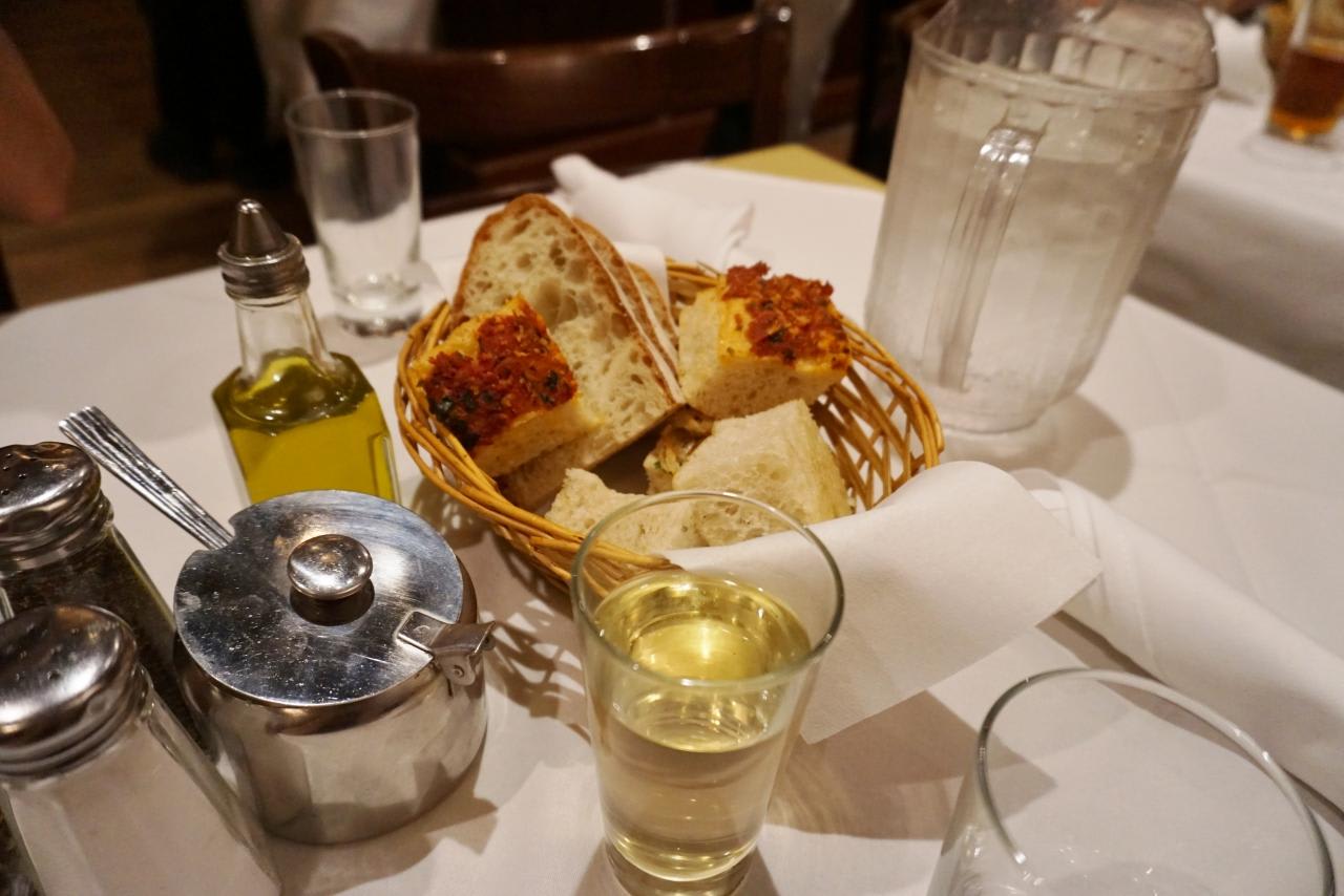 食べ放題のフォカッチャとハウスワインのデキャンタオーダー。