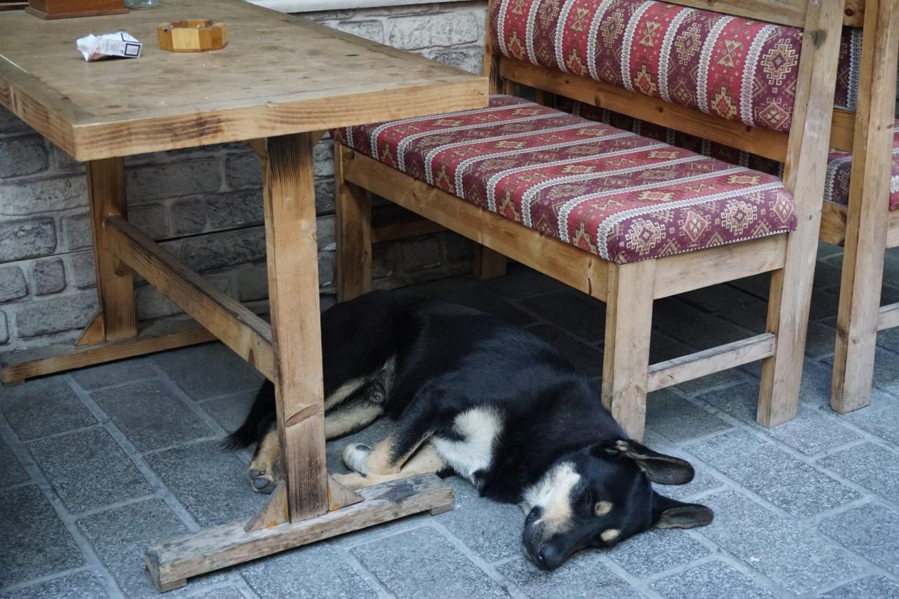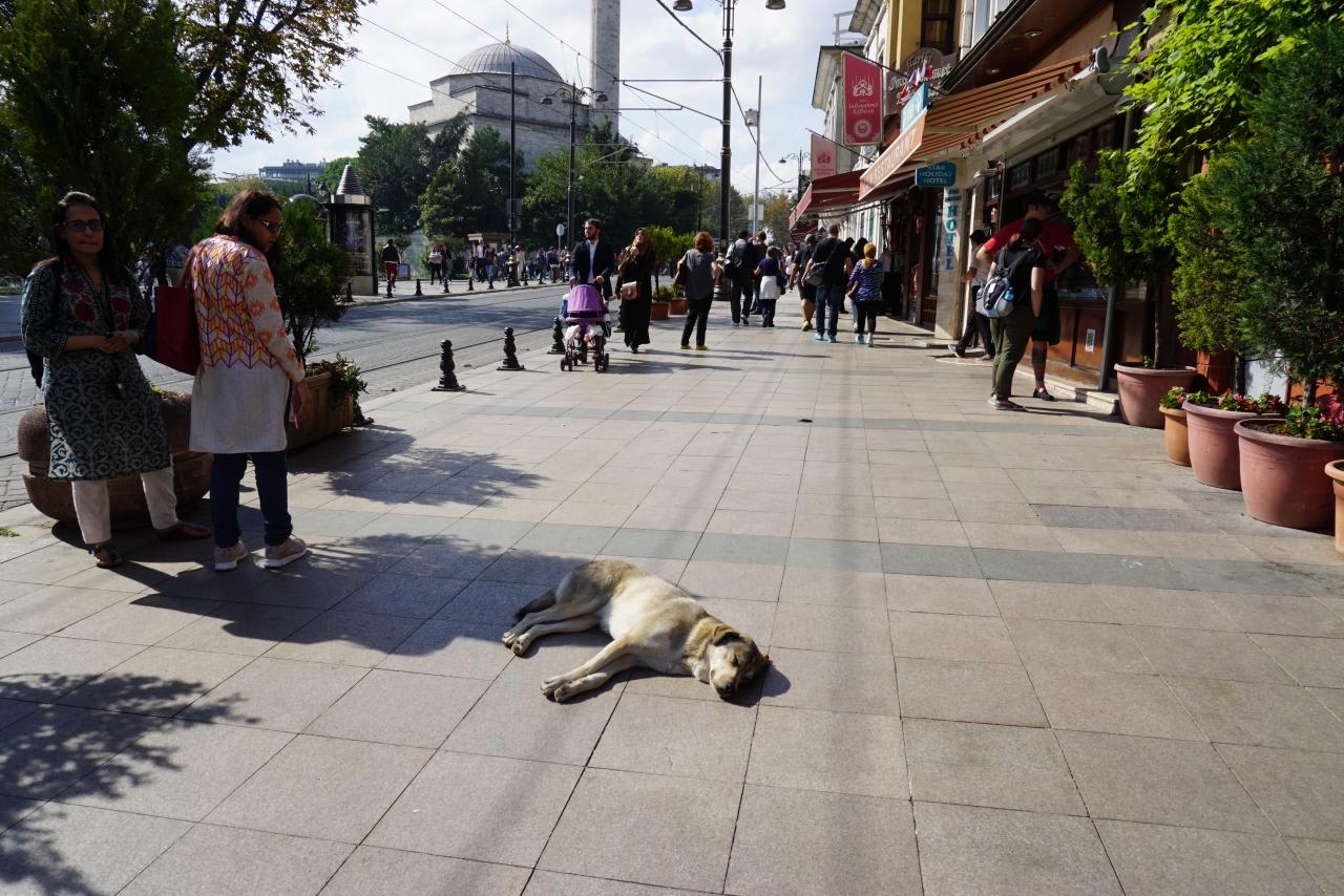 歩道のど真ん中で死んだように寝ている犬。これだけ混んでいるのにうっかり踏んじゃう人っていないんでしょうか。