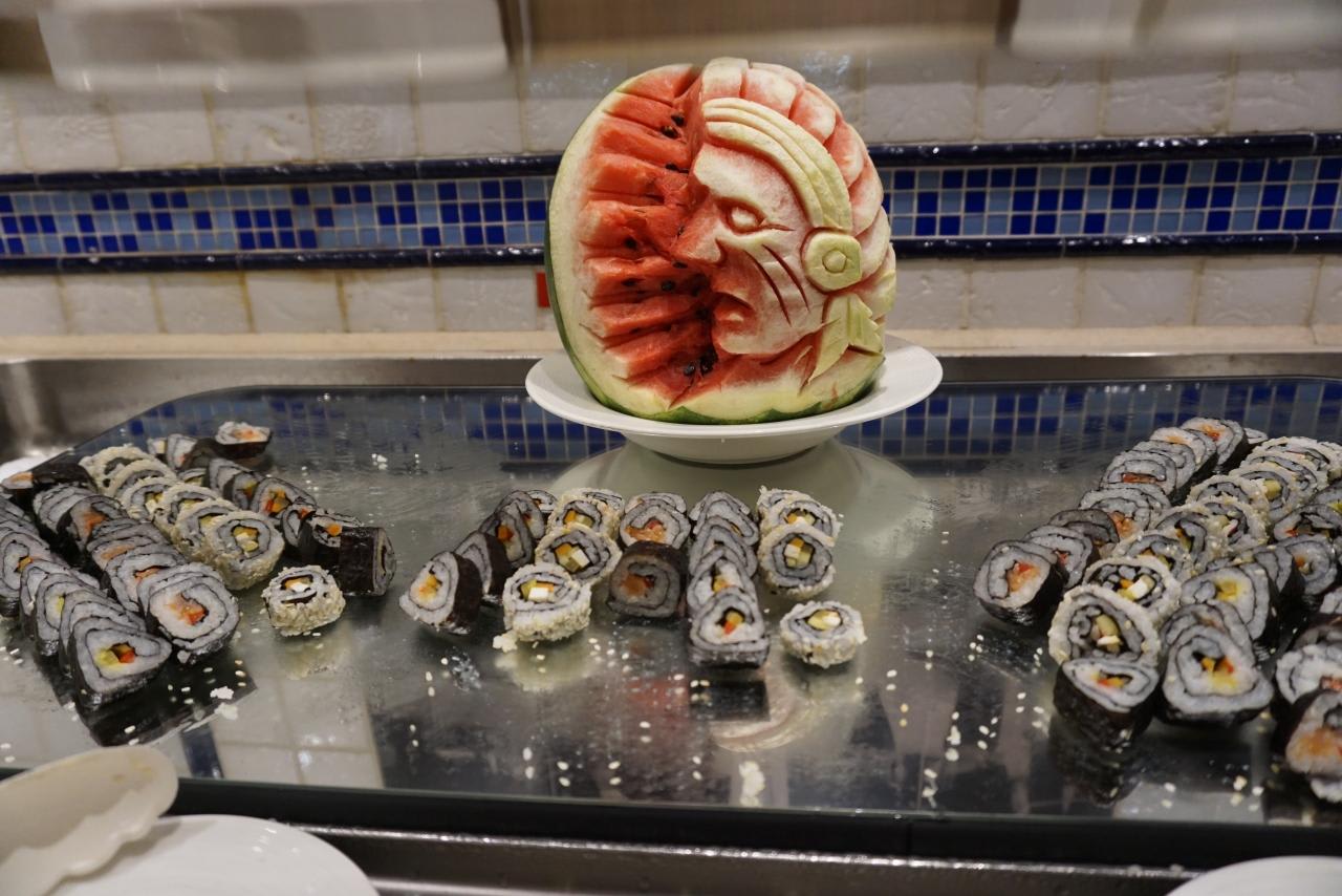 フルーツカービングで作られたインディアンと、SUSHI。