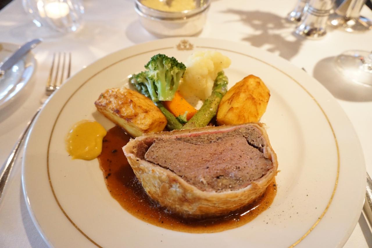 フォーマルディナーでのメインはビーフウェリントンとロブスター。