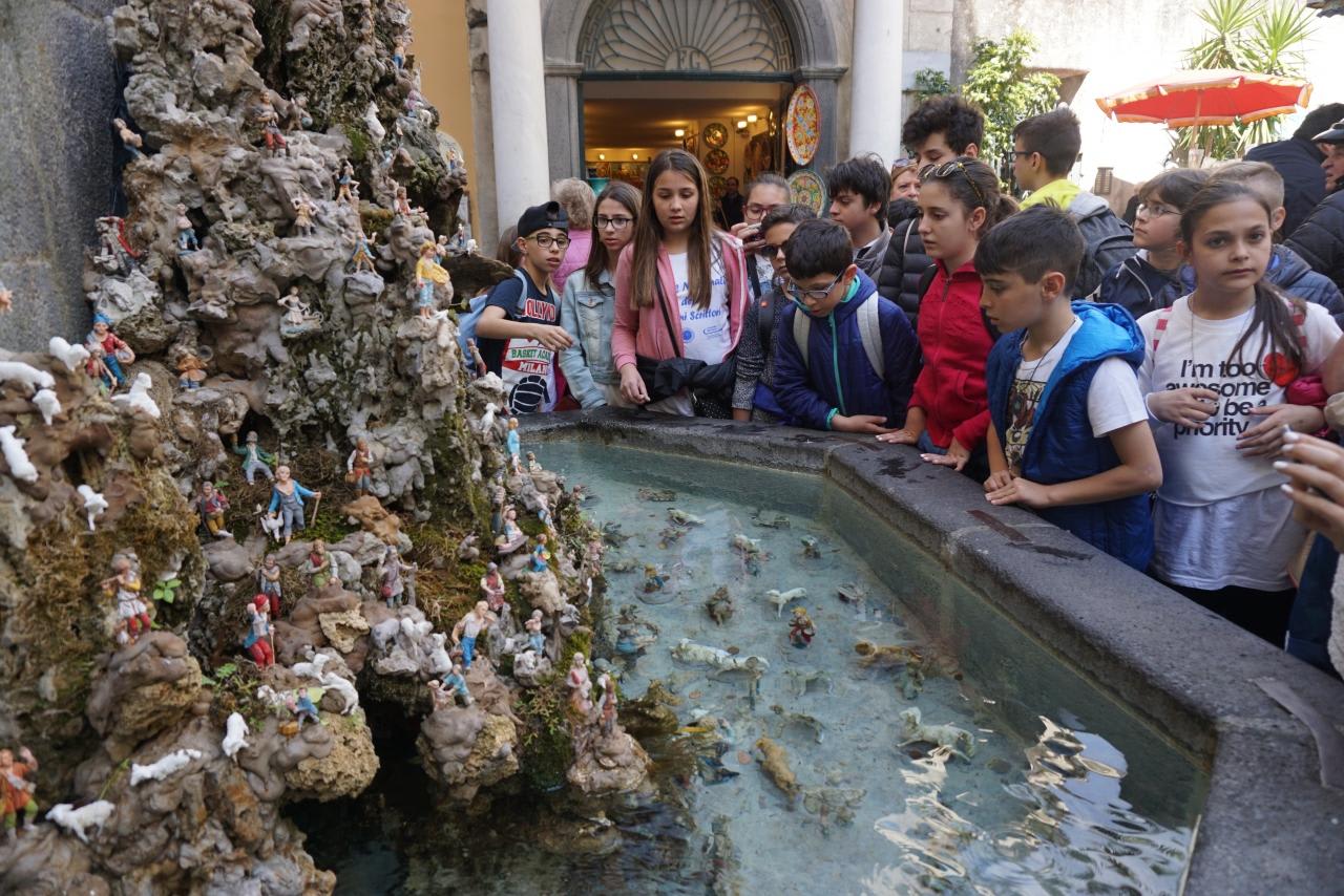 聖人たちの泉に遠足中の子供たちが興味津々。