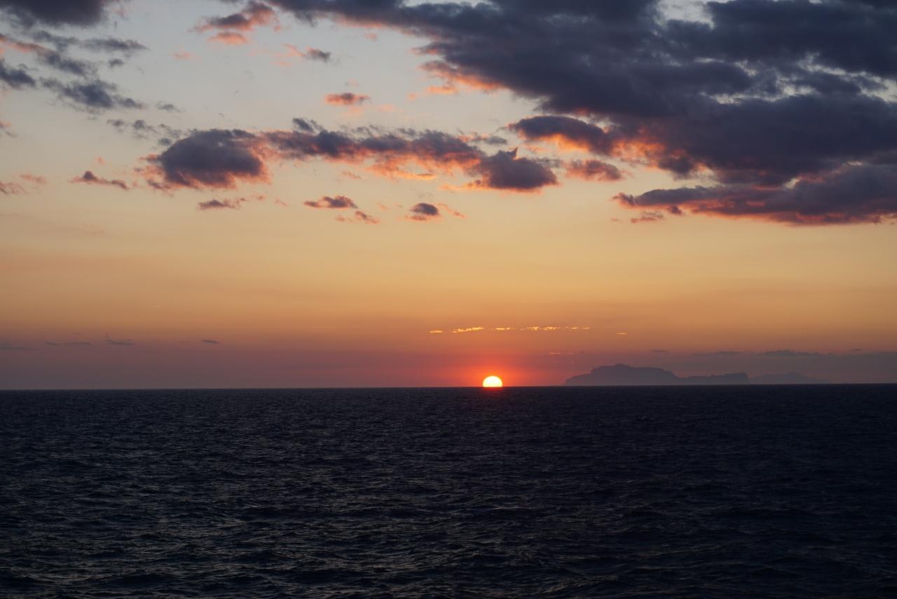 水平線に沈む夕日、クルーズならではのサンセットタイム。
