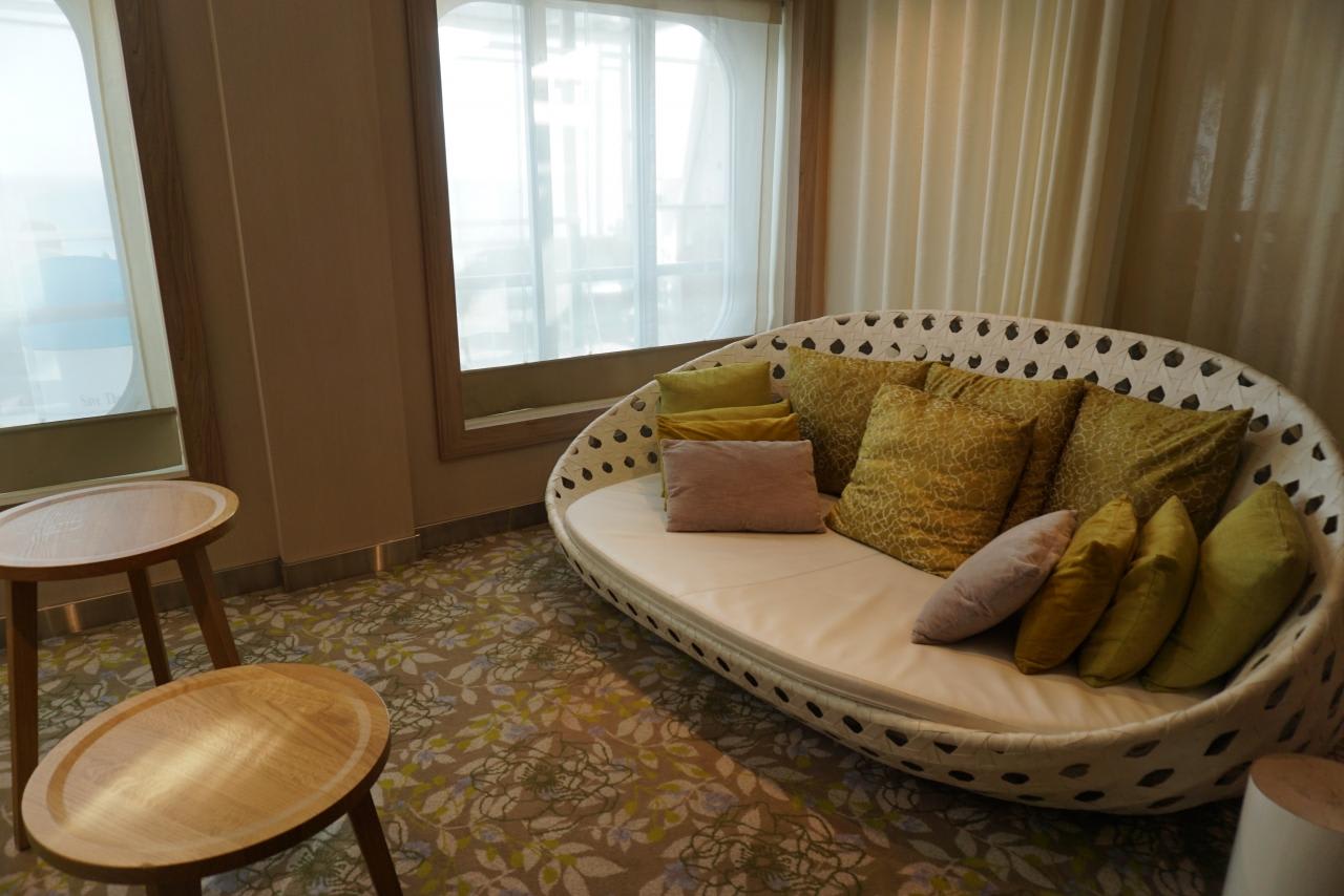 今までの船はバーの続きのような感じになっていて、注文しないと何となく居辛い気もしたけれども(実はそんなことは一切気にしなくていいんだけど)、この船は色々座ってみたくなるようなオシャレなソファーや面白い椅子が揃っていて楽しかったです。