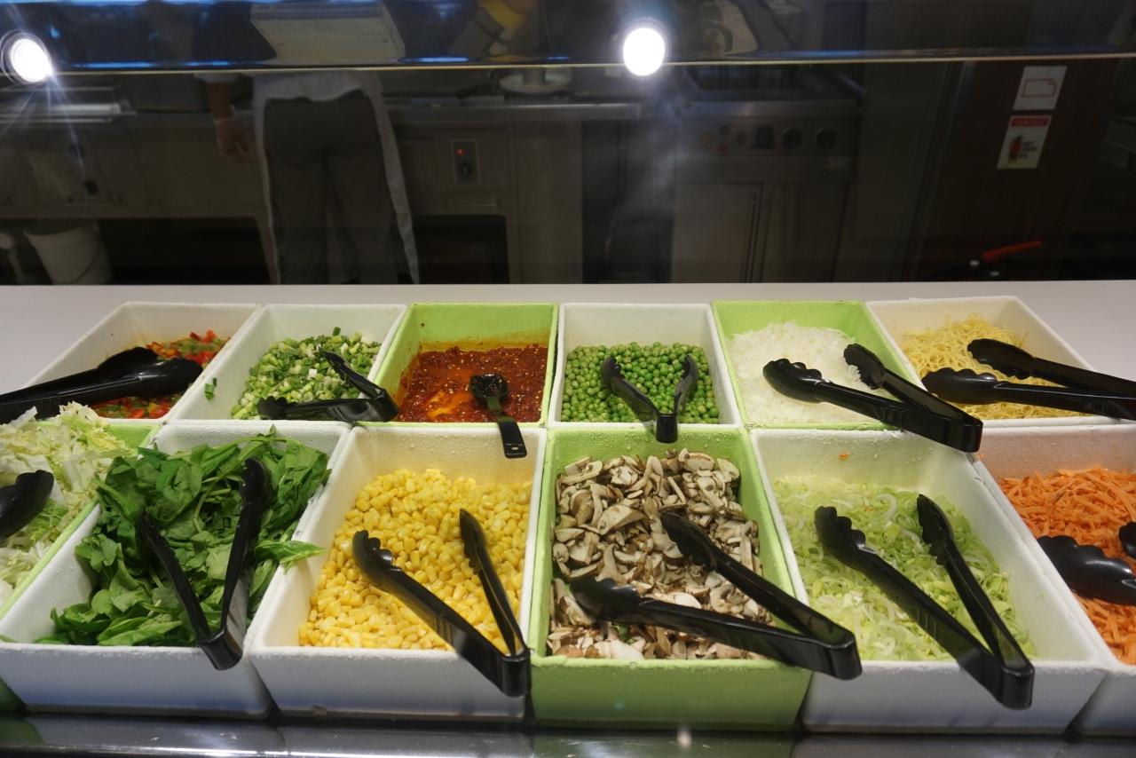 カットパプリカ、ネギ、生ホウレン草、生白菜、コーン、チリソース、マッシュルーム、グリンピース、ビーフン、ネギ、中華麺、ニンジン。