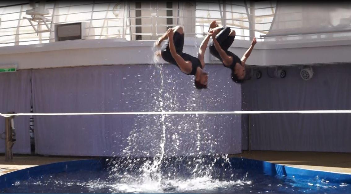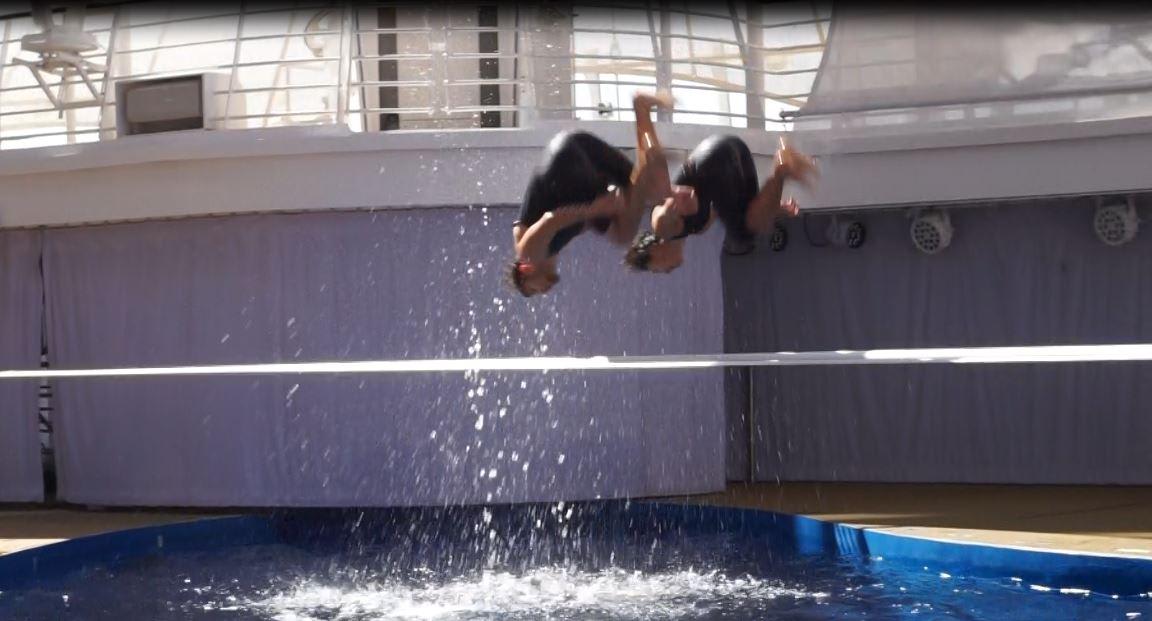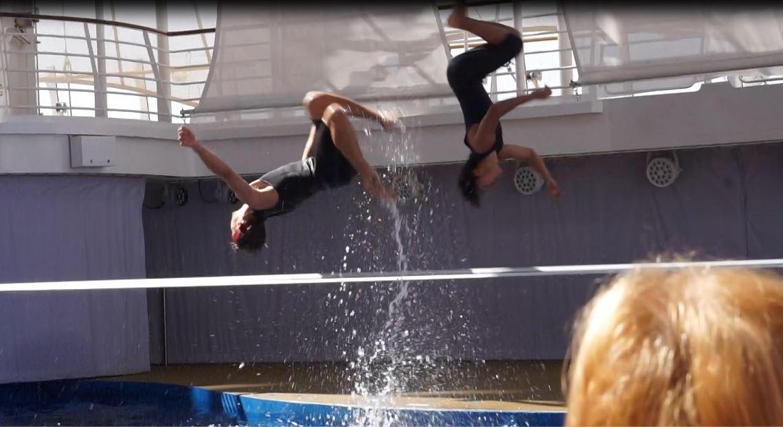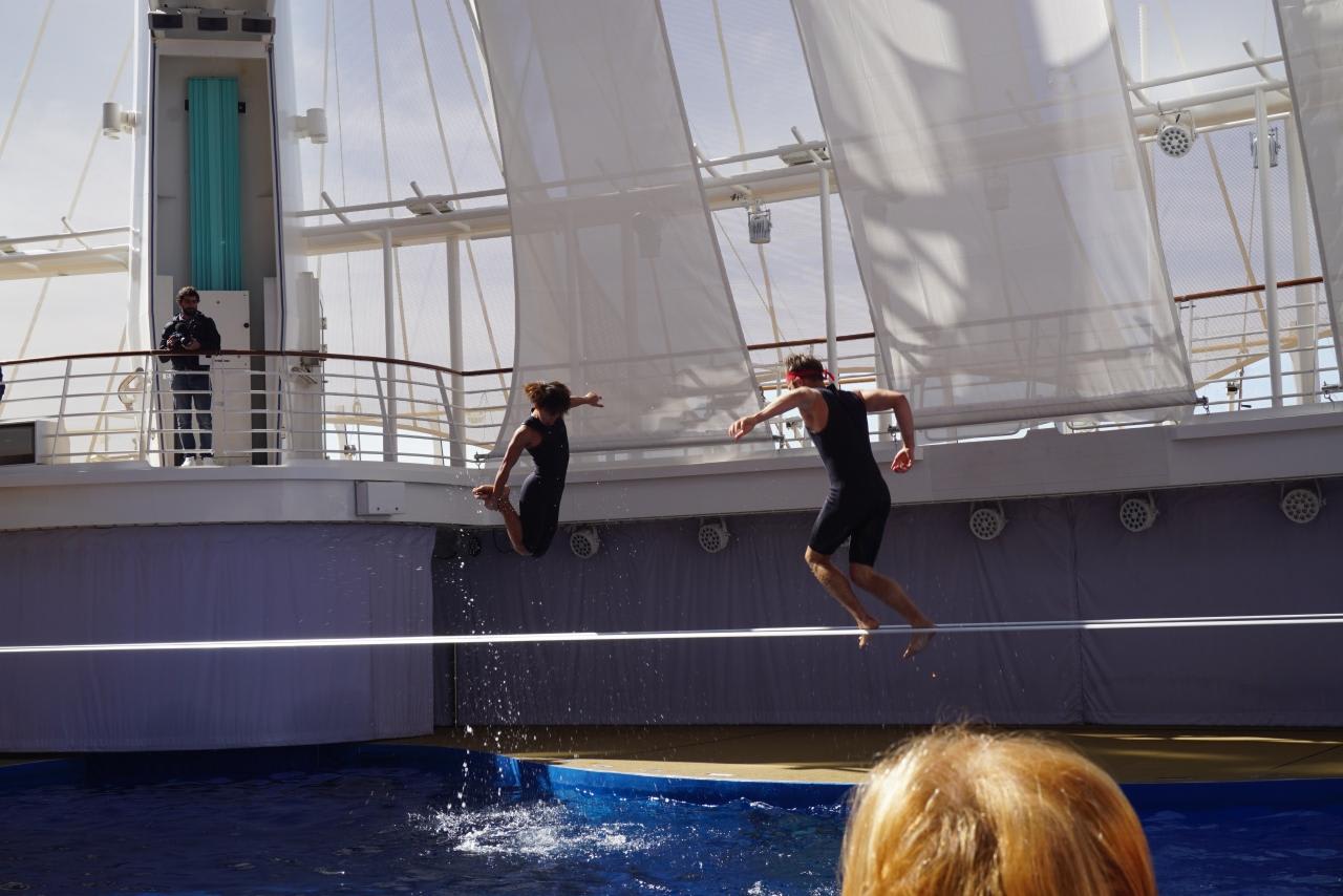 リピーター特典のミニショーはアクアシアターでのスラックラインでした。