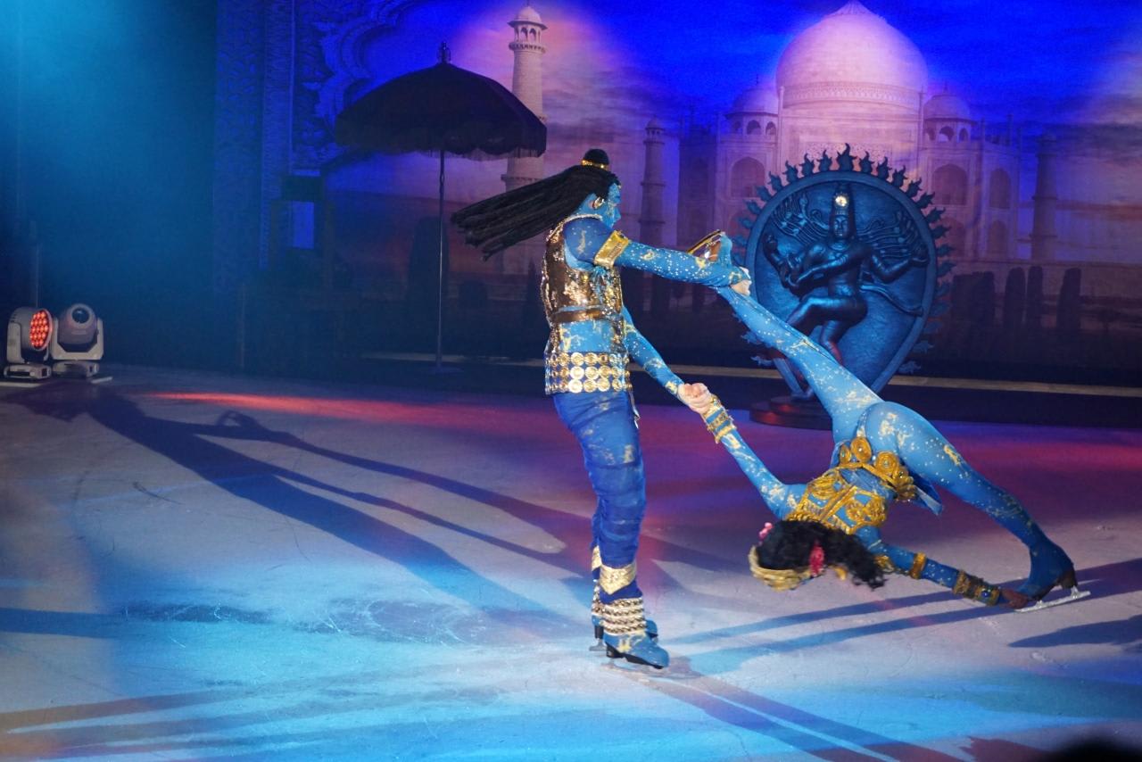 ロシアやアラブや様々な衣装を身に着けたスケーターがジャンプしたりスピンしたり。