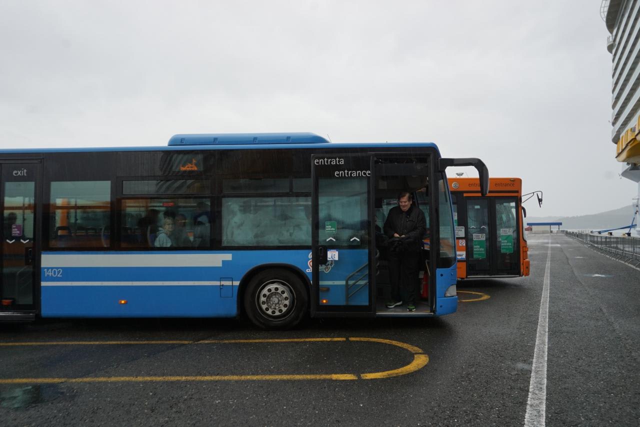 船から港入口までは無料のシャトルバスを利用。