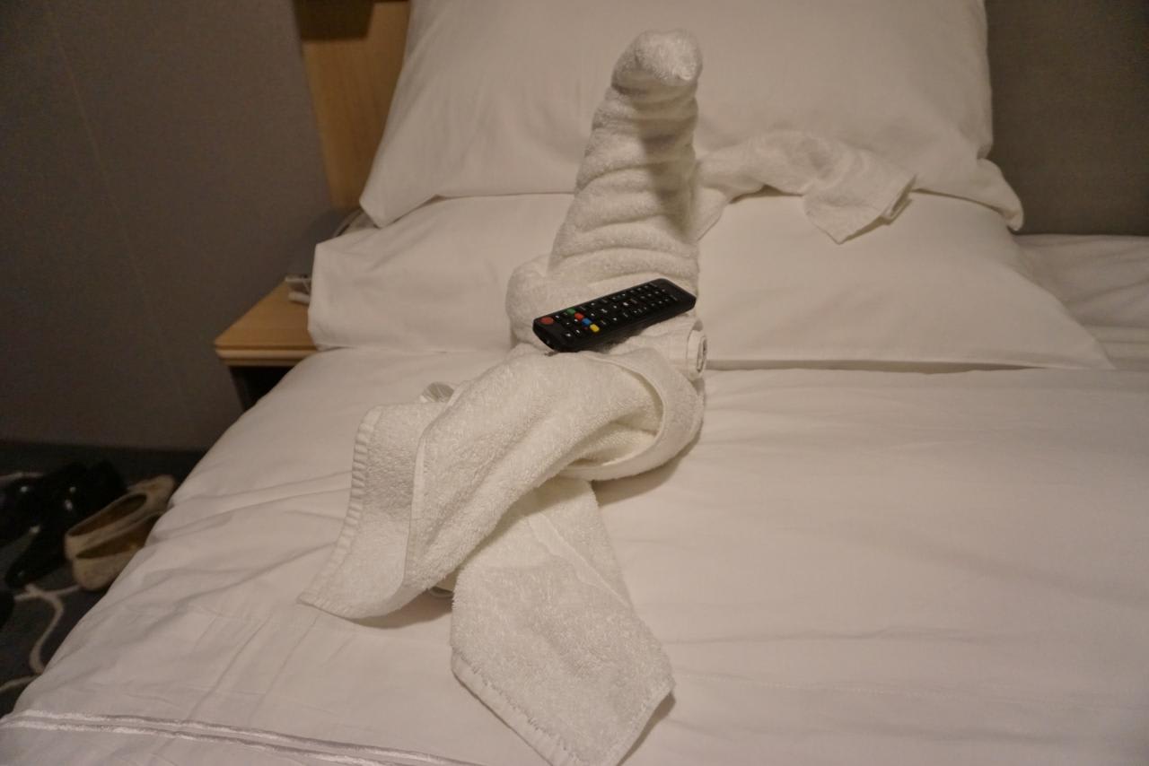 部屋に戻ると偉そうな格好のタオルアート。