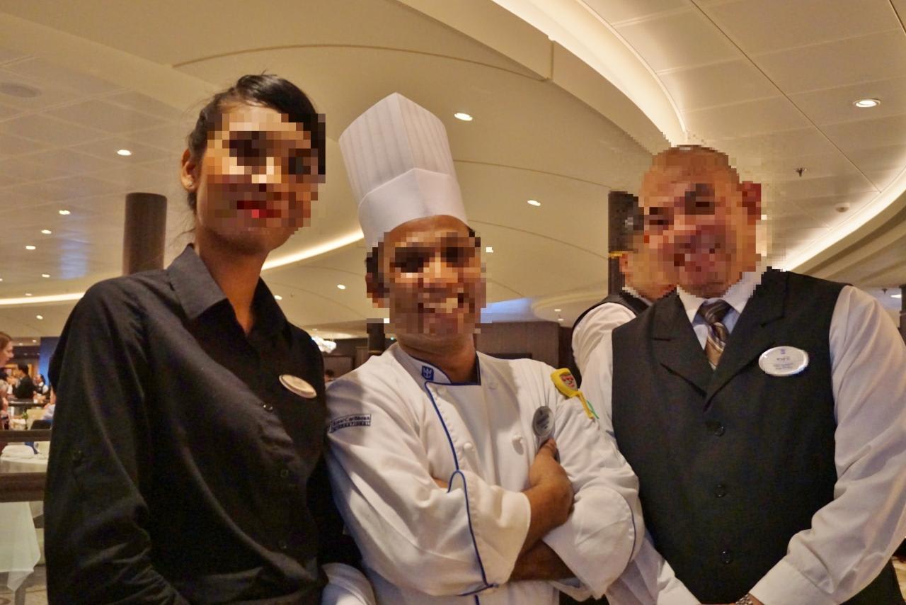 左から担当のアシスタントウェイター(モーリシャス)、シェフ(インド)、ウェイター(フィリピン)。