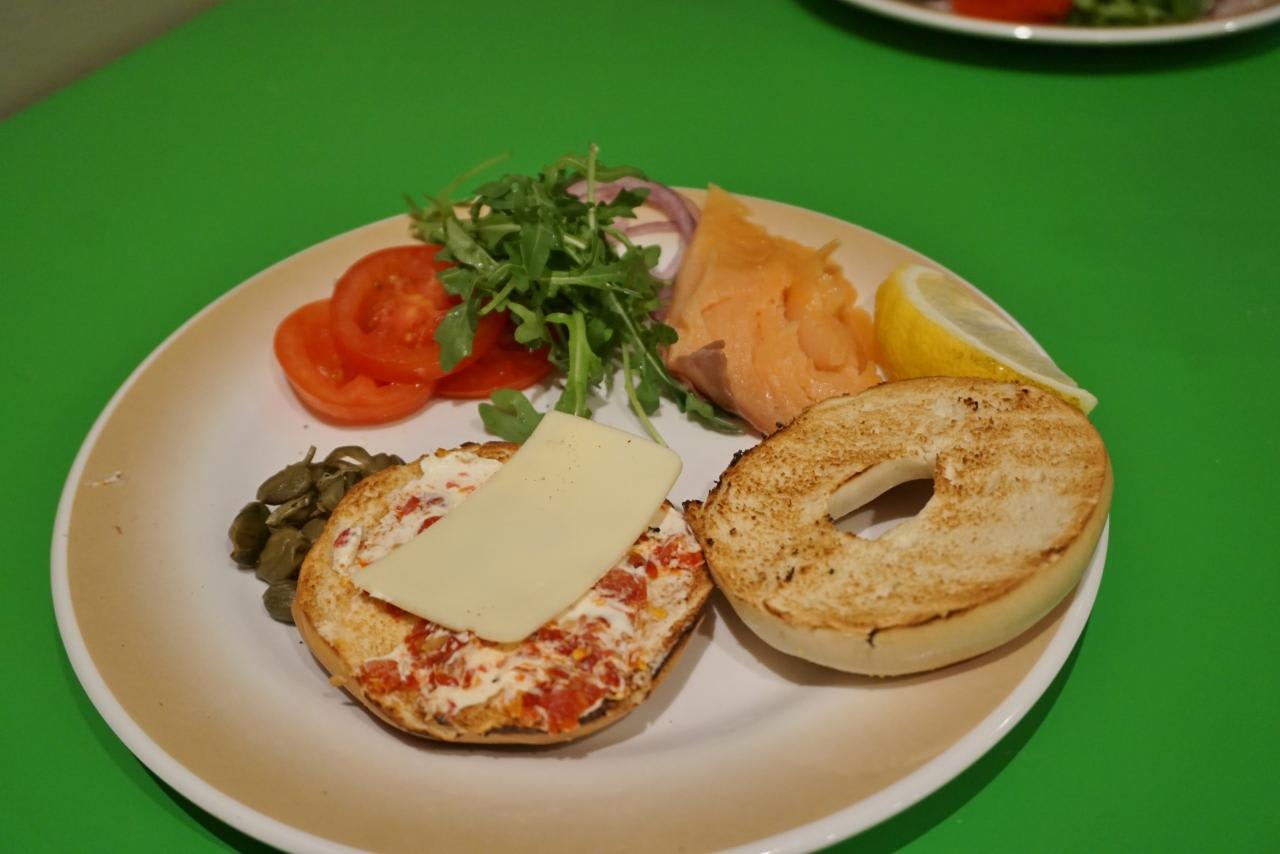 プレーンベーグルのトーストにサンドライトマトクリームチーズ(片側)、スモークサーモン、ルッコラ、トマト、ケイパー、そしてレモン。