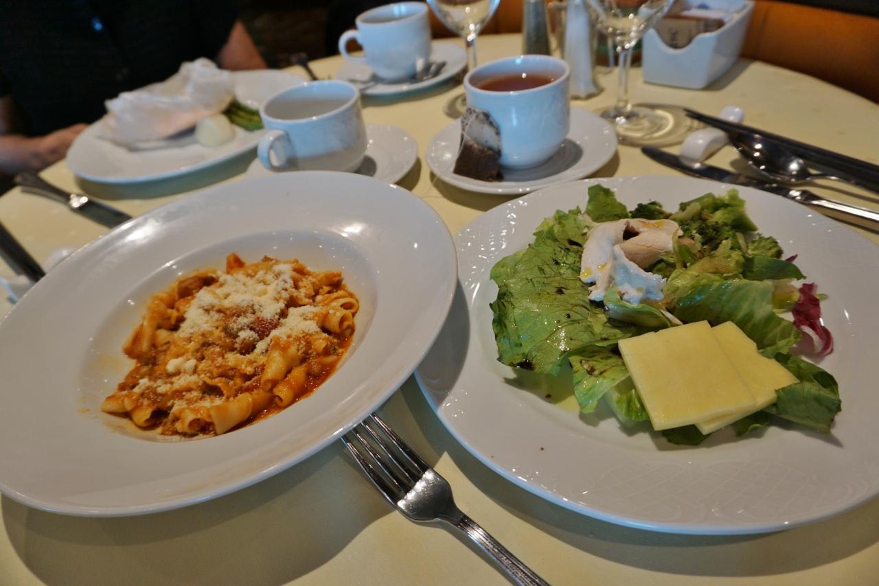 ビュッフェコーナーでサラダを貰って、アンコウのトマトソースパスタを頂きます。