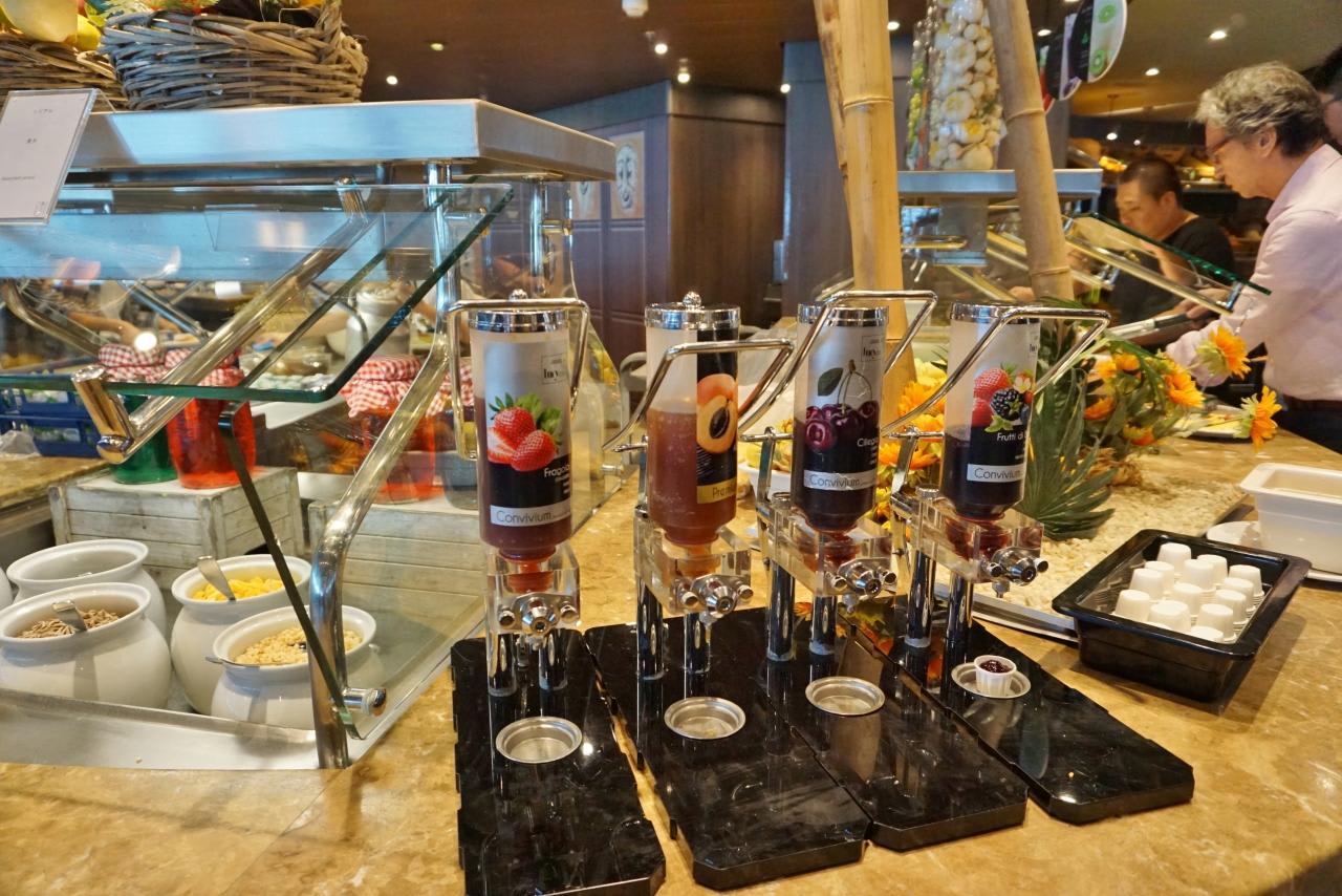 朝のビュッフェはパンケーキやワッフル用なのかシロップがずらりと並んでいます。