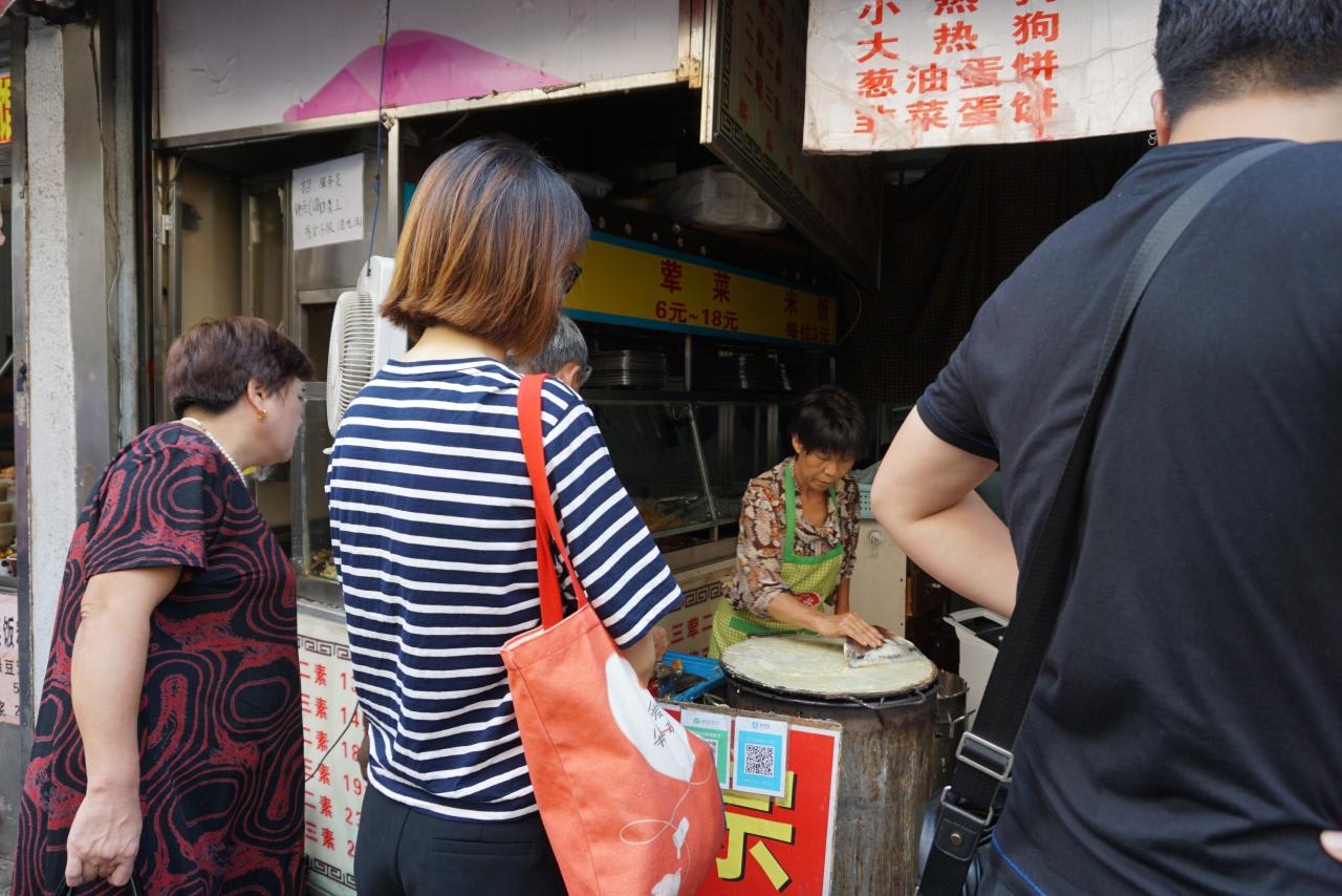 クレープのように粘り気のある生地を薄く敷き、卵、ネギ、刻みザーサイ、パクチーを入れて脆餅(ツイピン)という油で揚げたパリッとした煎餅のような天かすのようなものを入れてバリバリ砕いて畳んで少し甘い甜面醤を塗り、辣醤を塗って出来上がり。