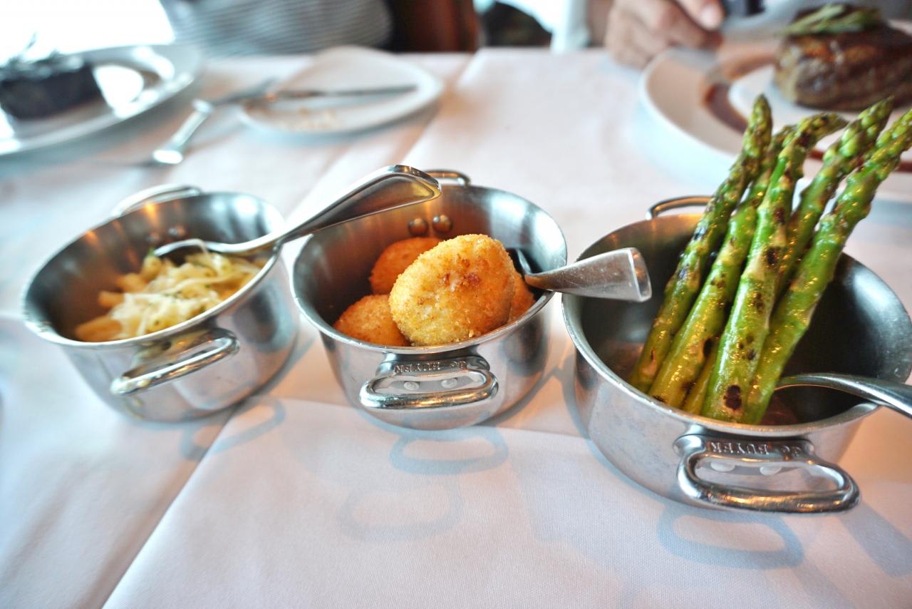 付け合せはアスパラのグリル、テータートッツ、マカロニ&チーズ。