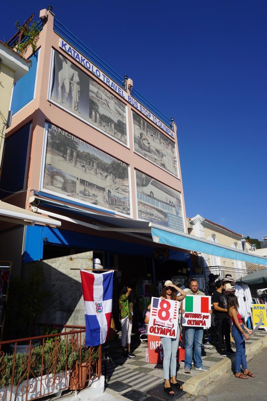 徒歩で港を抜けるとこんな感じでオリンピア遺跡までのバスの呼び込みがいます。